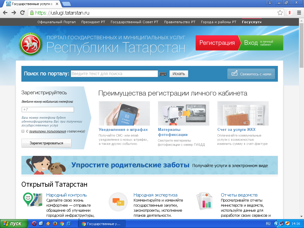 Для входа на Портал государственных и муниципальных услуг Республики Татарстан необходимо перейти по ссылке uslugi.tatarstan.ru