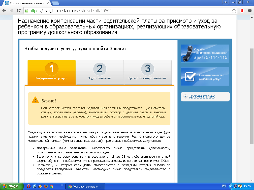 В целях популяризации предоставления государственных услуг в электронном виде Министерство труда, занятости и социальной защиты Республики Татарстан просит Вас оказать содействие в информировании родителей, дети которых посещают образовательные организации, реализующие образовательную программу дошкольного образования, о возможности подачи электронного заявления на назначение вышеуказанных компенсаций на Портале (информация прилагается). При подаче электронного заявления личное обращение гражданина в органы социальной защиты не требуется. Решение, по направленному заявлению, размещается в «Личном кабинете» гражданина.
