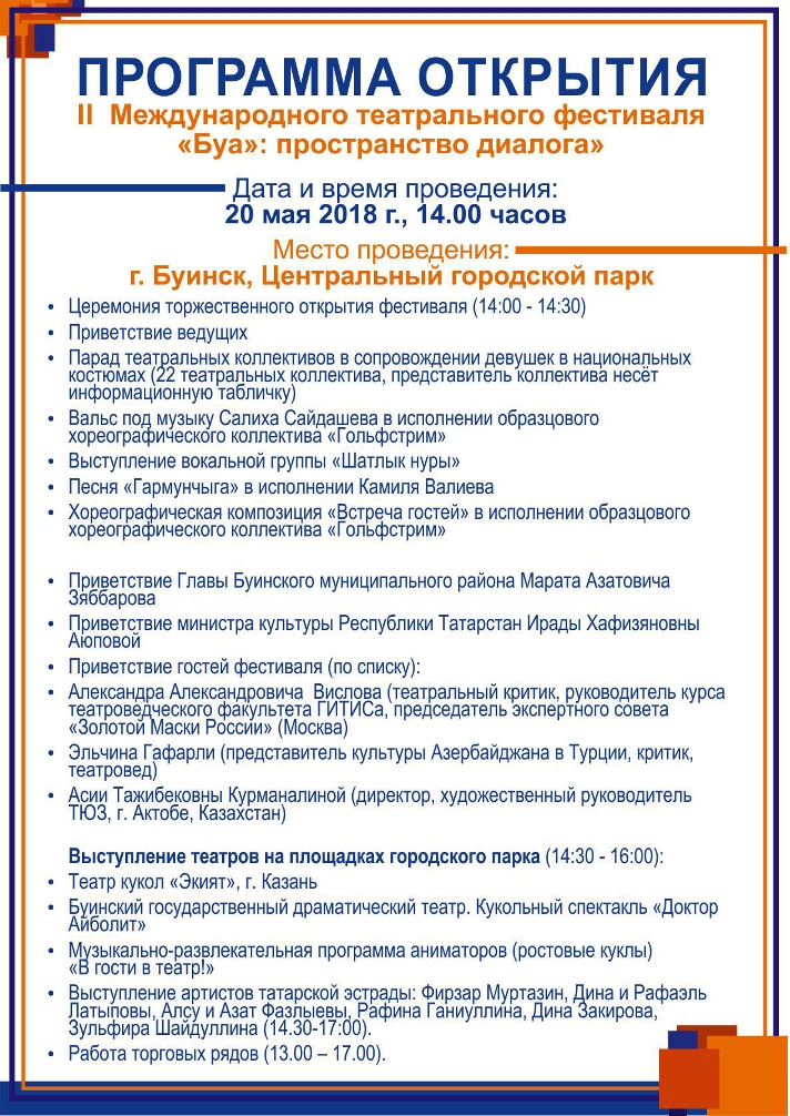 20 мая 2018 в 14:00 в Центральном парке состоится торжественное открытие II Международного театрального фестиваля "Буа: пространство диалога". Буинск откроет двери для всех участников фестиваля, буинцев, гостей нашего района, чтобы вместе в солнечный весенний день окунуться в атмосферу творчества, исскуства и культуры, и увидеть калейдоскоп разнообразных театров и ярких выступлений!