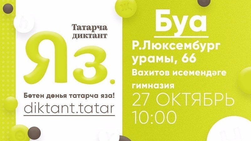 27 октября в 9 странах и 20 регионах РФ пройдет образовательная акция по проверке грамотности на татарском языке "Татарча диктант". В Буинске "Татарча диктант" напишут на базе МБОУ "Гимназия им.М.Вахитова г. Буинск РТ" по адресу: г.Буинск ул.Р.Люксембург, дом 66. Начало мероприятия в 10.00 часов.