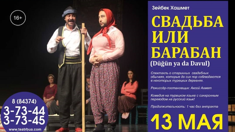 В рамках III Международного фестиваля национальных театров "БУА: ПРОСТРАНСТВО ДИАЛОГА" Буинский муниципальный район посетит Муниципальный театр г. Мерсин. 13 мая в Центре культурного развития ими будет показан спектакль Зейбека Хашмета "Свадьба или барабан"(Düğün ya da Davul). Спектакль о старинных свадебных обычаях, которые до сих пор соблюдаются в некоторых турецких деревнях. Комедия на турецком языке с синхронным переводом на русский язык!