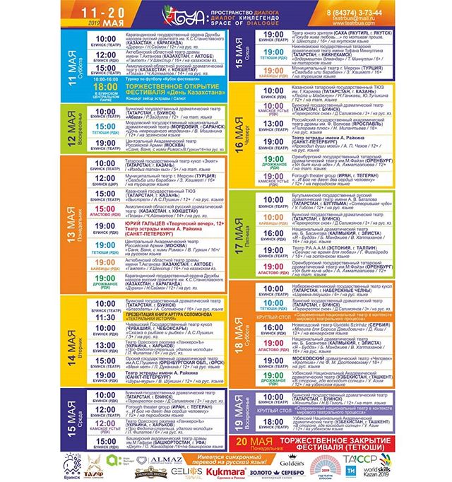 Официальное открытие фестиваля состоится 11 мая 2019 года в 18.00 в Центральном парке города Буинска. Также в этот день, в рамках данного фестиваля, в нашем городе пройдет «День Казахстана», где примут участие и покажут свои спектакли известные театральные коллективы из Республики Казахстан: Актюбинский областной театр драмы имени Т.Ахтанова, Карагандинский государственный ордена Дружбы народов русский драматический театр имени К.С.Станиславского, Акмолинский областной русский драматический театр.