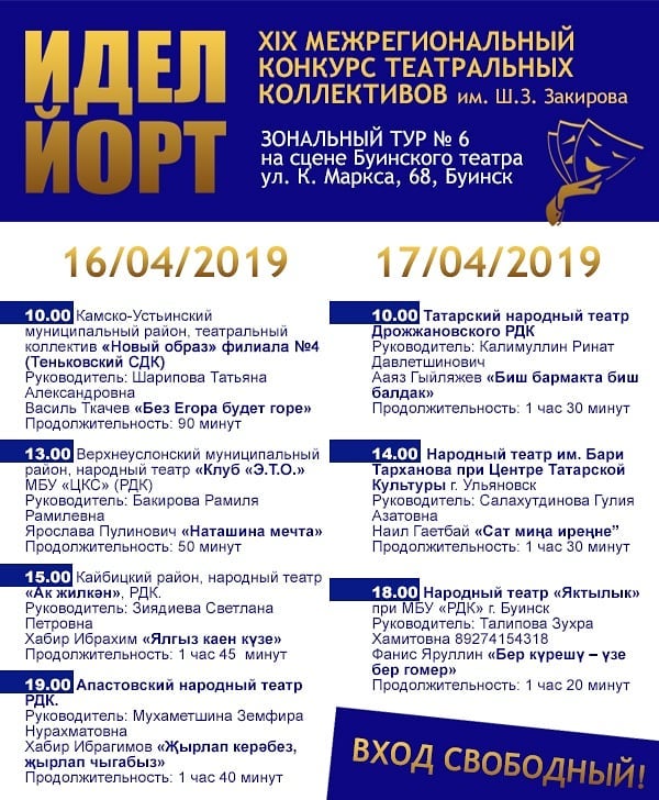 16-17 апреля на базе Буинского государственного драматического театра пройдет зональный тур XIX Межрегионального конкурса театральных коллективов «Идел-йорт» имени Ш.З.Закирова.