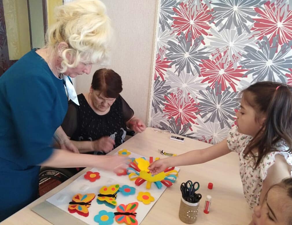 Проживающие совместно с воспитанниками детского сада создали композицию «Пусть всегда будет солнце» из фетра, цветной бумаги и картона. Дошкольники с большим усердием вырезали цветы из цветной бумаги, а проживающие тем временем делали бабочек из фетра. Композиция получилась яркой и жизнерадостной. Мастер-класс воспитанников детского сада принес нашим подопечным настоящую радость. Малыши, даже не замечая этого, сделали настоящее доброе дело – подарили тепло и внимание тем, кто в этом очень нуждается.