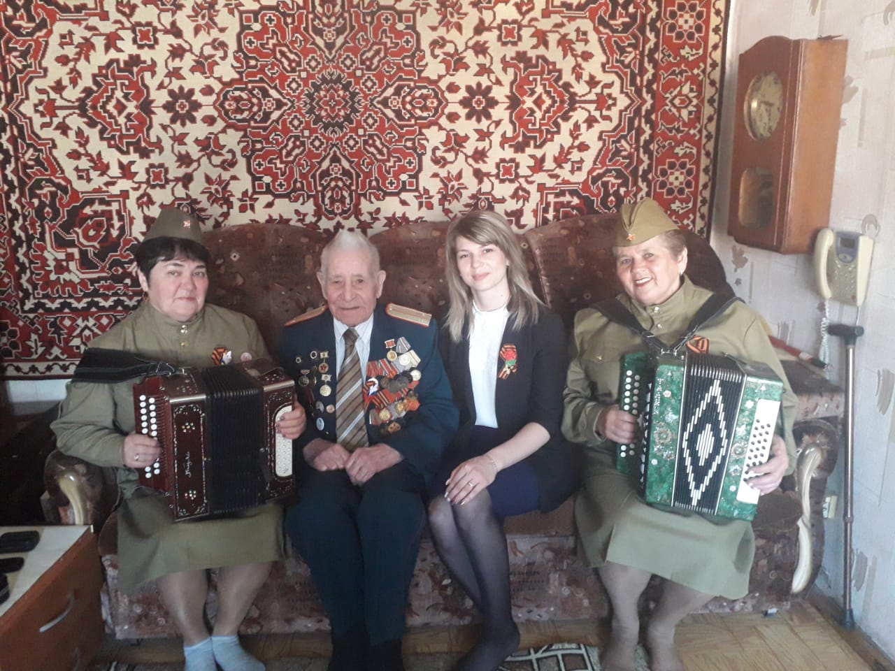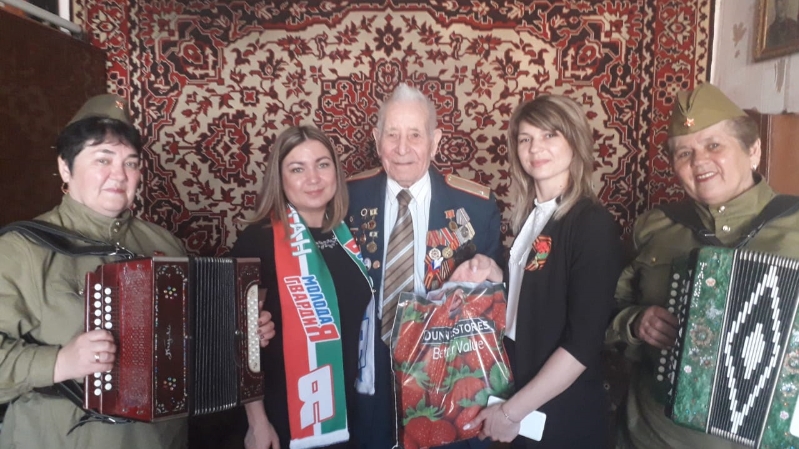 Сегодня, 8 мая, Исполнительный секретарь Буинского местного отделения партии «ЕДИНАЯ РОССИЯ» Наталья Храмова, совместно с Председателем Буинского районного Совета ветеранов Зяугарией Хуснутдиновой с группой гармонистов и руководителем местного штаба «Молодой Гвардии Единой России» Альбиной Булатовой, приехали с визитом к участнику ВОВ Гарифу Сафиуллину. Ветерану были сыграны различные военные песни, высказаны теплые слова, поздравления в честь приближающегося праздника 74–ой годовщины Великой Победы и вручен продовольственный пакет. Гариф Сафиуллин поблагодарил всех за поздравления и пожелал всем удачи, здоровья и добра.