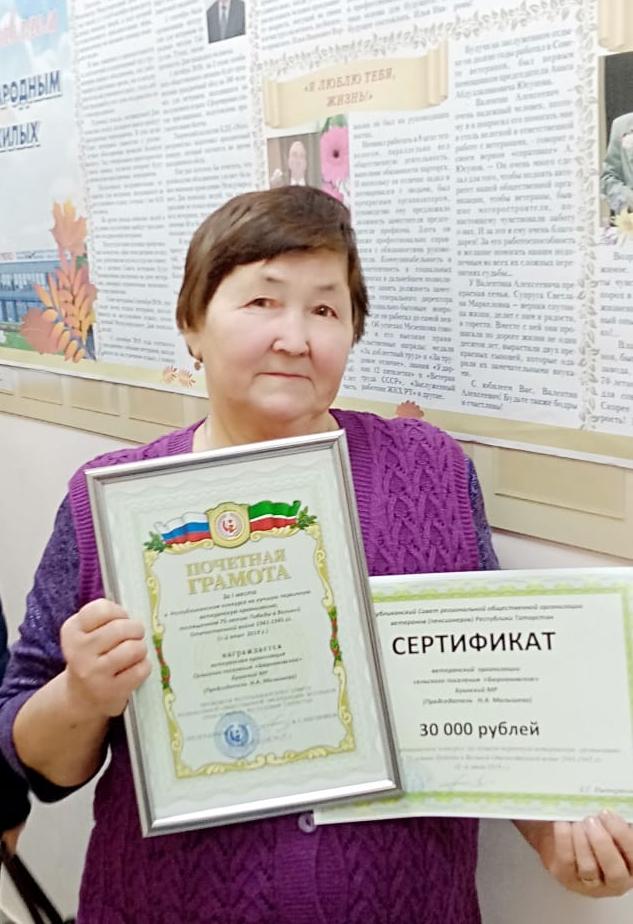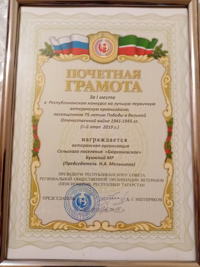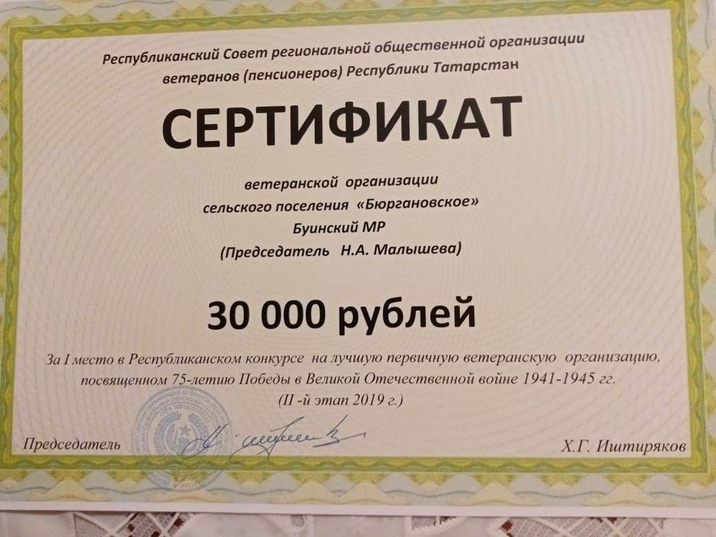 По итогам конкурса среди первичных Ветеранских организаций 1-ое место заняло Бюрганское сельское поселение Буинского муниципального района. Почетную грамоту и сертификат на 30 тысяч рублей вручили председателю сельского поселения Малышевой Нине Андреевне.
