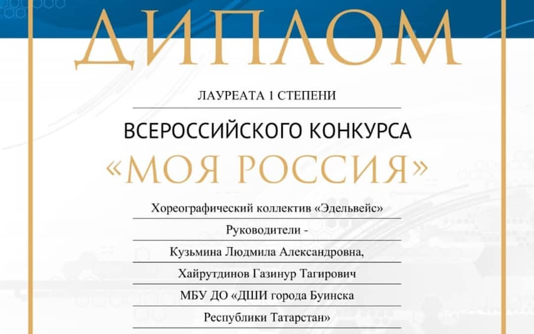 Хореографический коллектив "Эдельвейс" детской школы искусств МКУ "Управление образования Буинского мунципального района РТ" под руководством Кузьминой Л.А. и Хайрутдинова Г. Т. с танцем " Завалинка" стал Лауреатом 1 степени Всероссийского конкурса " Моя Россия", проводимый Академией Народной Энциклопедии в рамках реализации Общероссийского инновационного проекта "Моя Россия", который направлен на изучение истории и культуры страны, ее регионов, привлечение к творчеству и научно-исследовательской работе, продвижение научных, методических и творческих достижений.