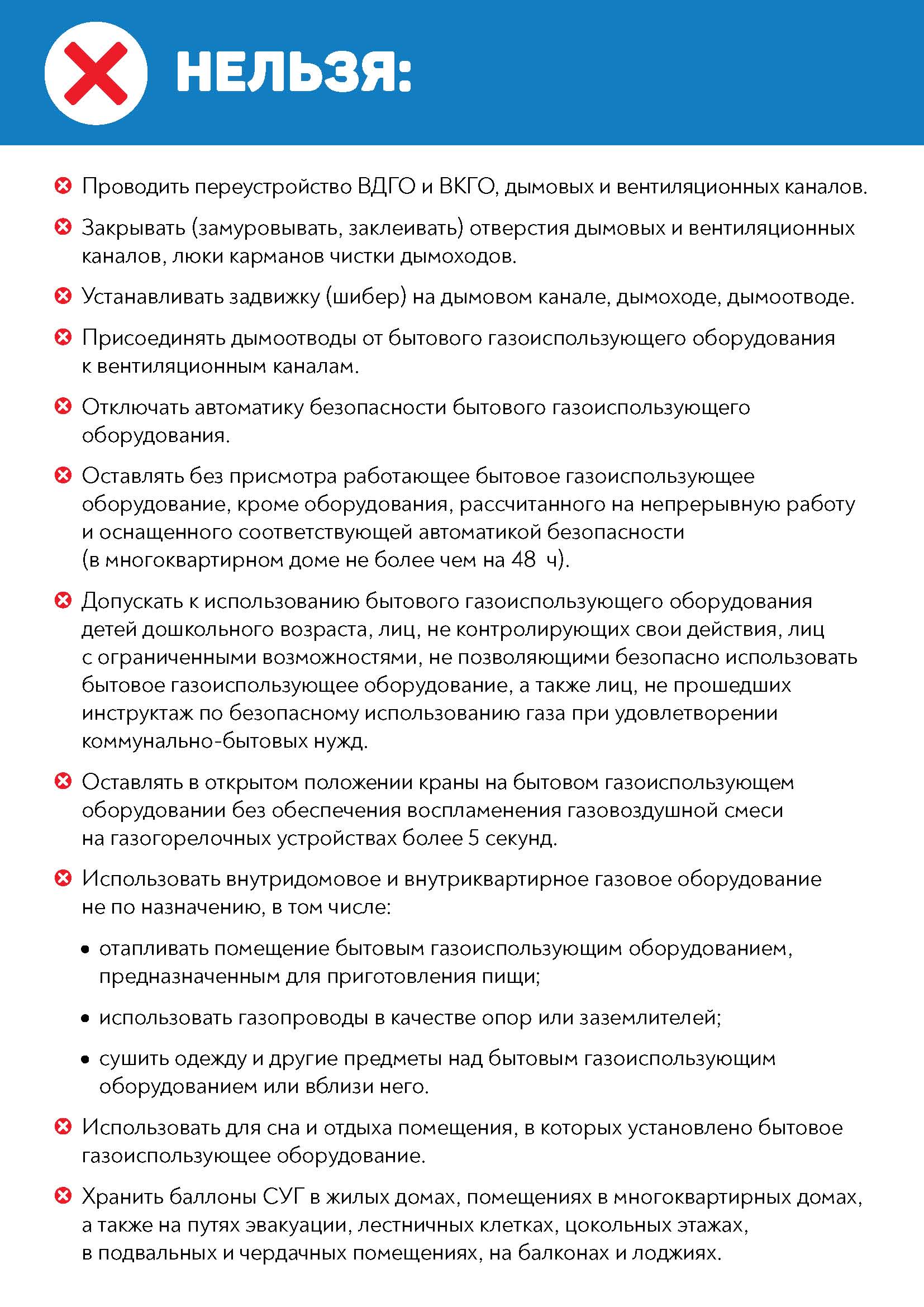 Также в памятке перечислено, чего нельзя делать при эксплуатации газового оборудования.
