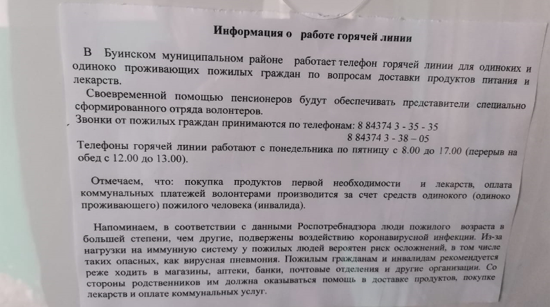 Начала работать «горячая линия» для проживающих в районе одиноких пожилых людей. Обратившимся продукты, лекарства принесут волонтеры. Это связано с введенным в республике особым санитарно-эпидемиологическим режимом. Тел.: 8 (84374) 3-35-35, 3-38-05. Отмечаем, что: покупка продуктов первой необходимости и лекарств, оплата коммунальных платежей волонтерами производится за счет средств одинокого (одиноко проживающего) пожилого человека (инвалида).