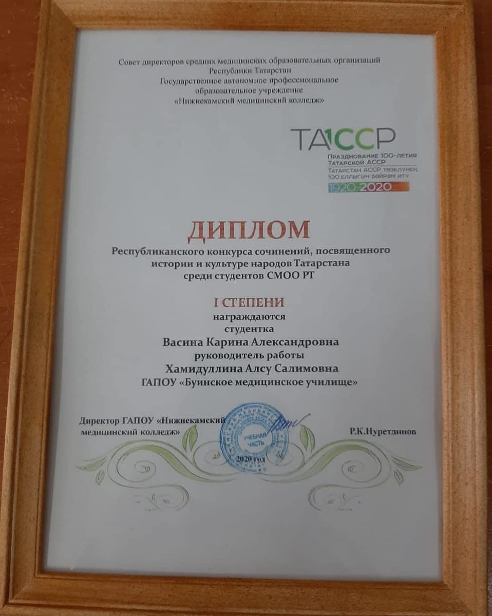 Студентка ГАПОУ "Буинское медицинское училище" Васина Карина заняла 1 место в Республиканском конкурсе сочинений, посвященных истории и культуре народов Татарстана среди студентов средних медицинских образовательных организаций Республики Татарстан (преподаватель Хамидуллина А.С.). Поздравляем! Желаем дальнейших успехов.