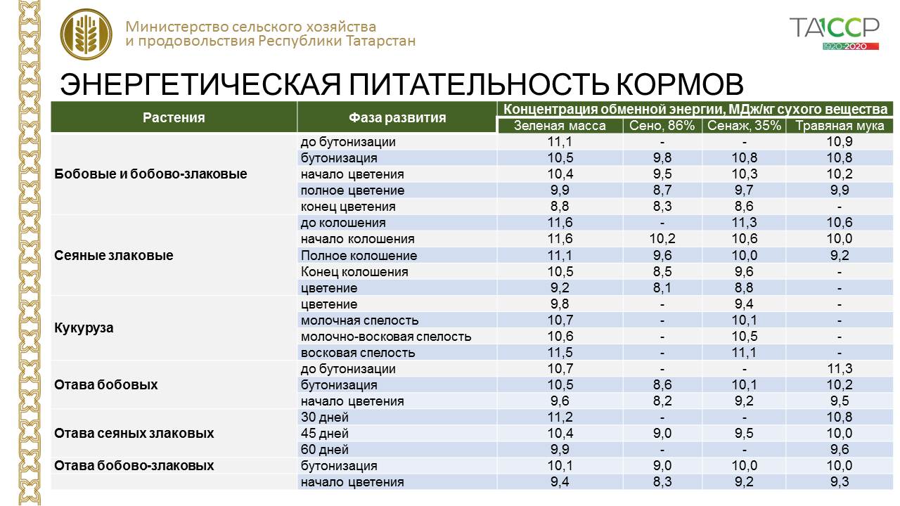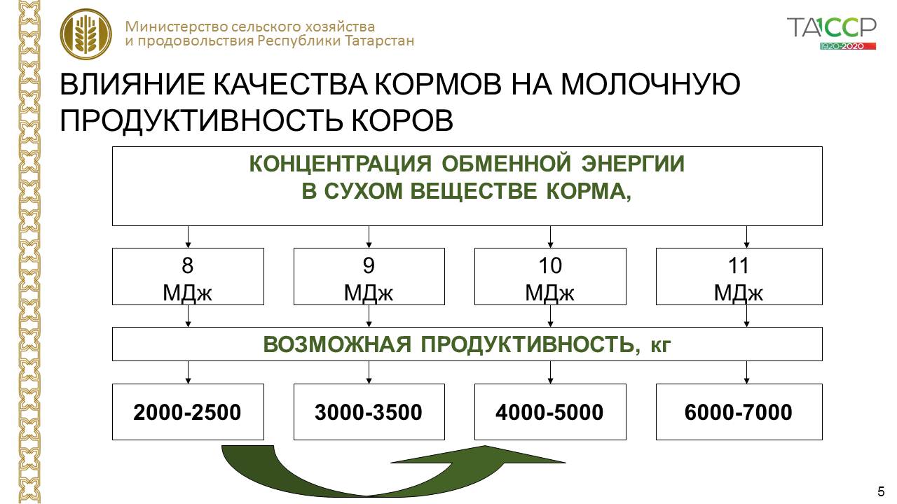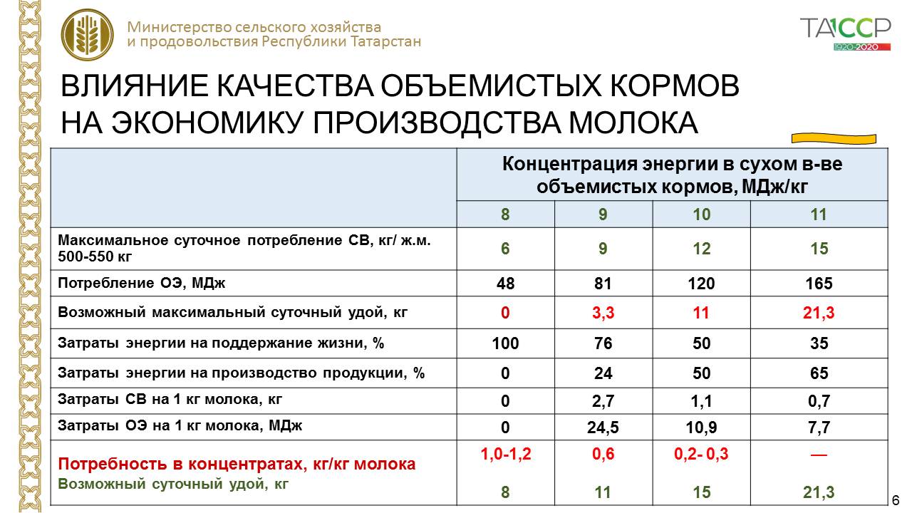 По новым стандартам кормления учет потребности животных и оценка питательности кормов будет производится в обменной энергии, содержащейся в сухом веществе корма. Чем выше концентрация обменной энергии в кормах, тем выше поедаемость СВ и продуктивность коров. На производство 1 литра молока потребуется в среднем 700 г сухого вещества при содержании до 11 МДж обменной энергии. Чем ниже концентрация энергии в сухом веществе, тем выше расходы на производство продукции.