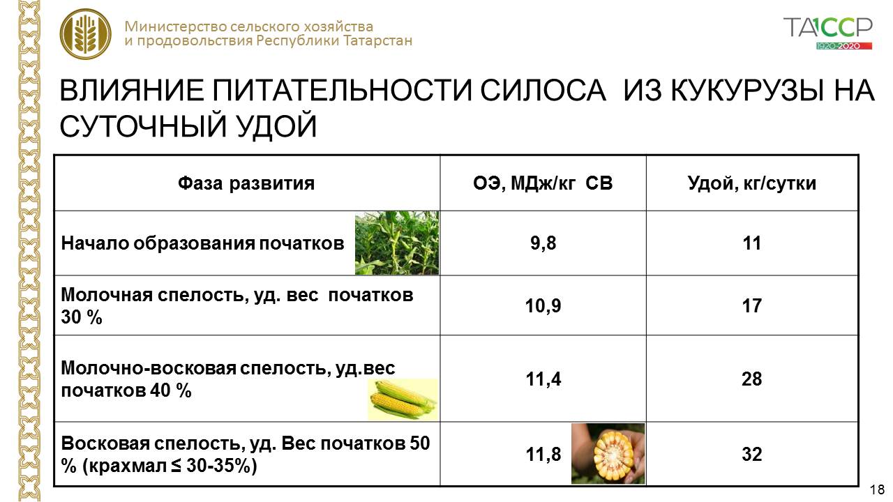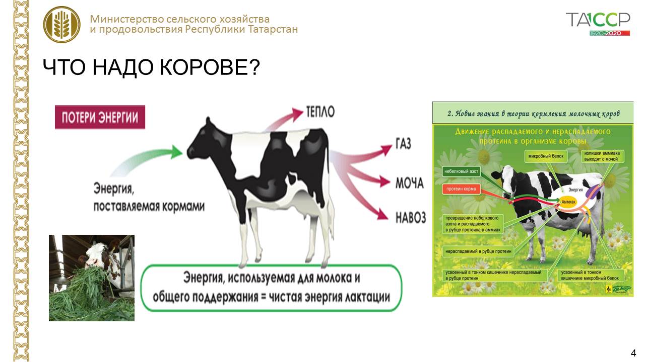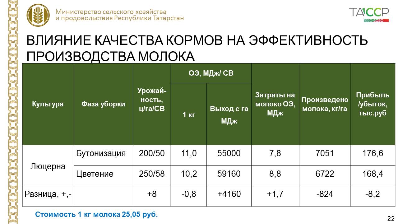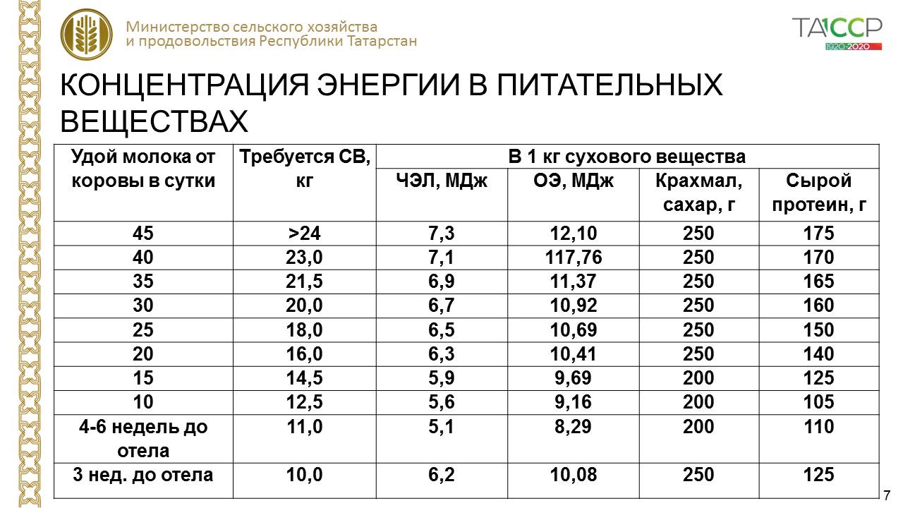 По новым стандартам кормления учет потребности животных и оценка питательности кормов будет производится в обменной энергии, содержащейся в сухом веществе корма. Чем выше концентрация обменной энергии в кормах, тем выше поедаемость СВ и продуктивность коров. На производство 1 литра молока потребуется в среднем 700 г сухого вещества при содержании до 11 МДж обменной энергии. Чем ниже концентрация энергии в сухом веществе, тем выше расходы на производство продукции.