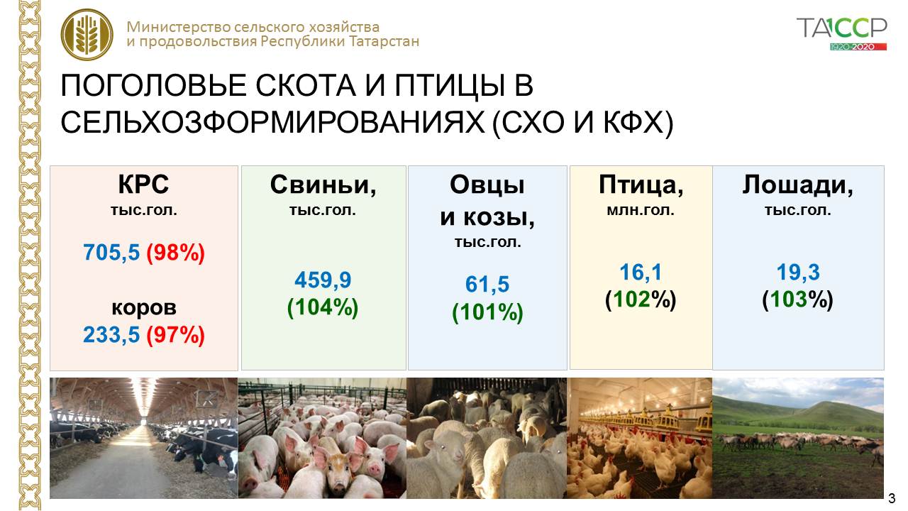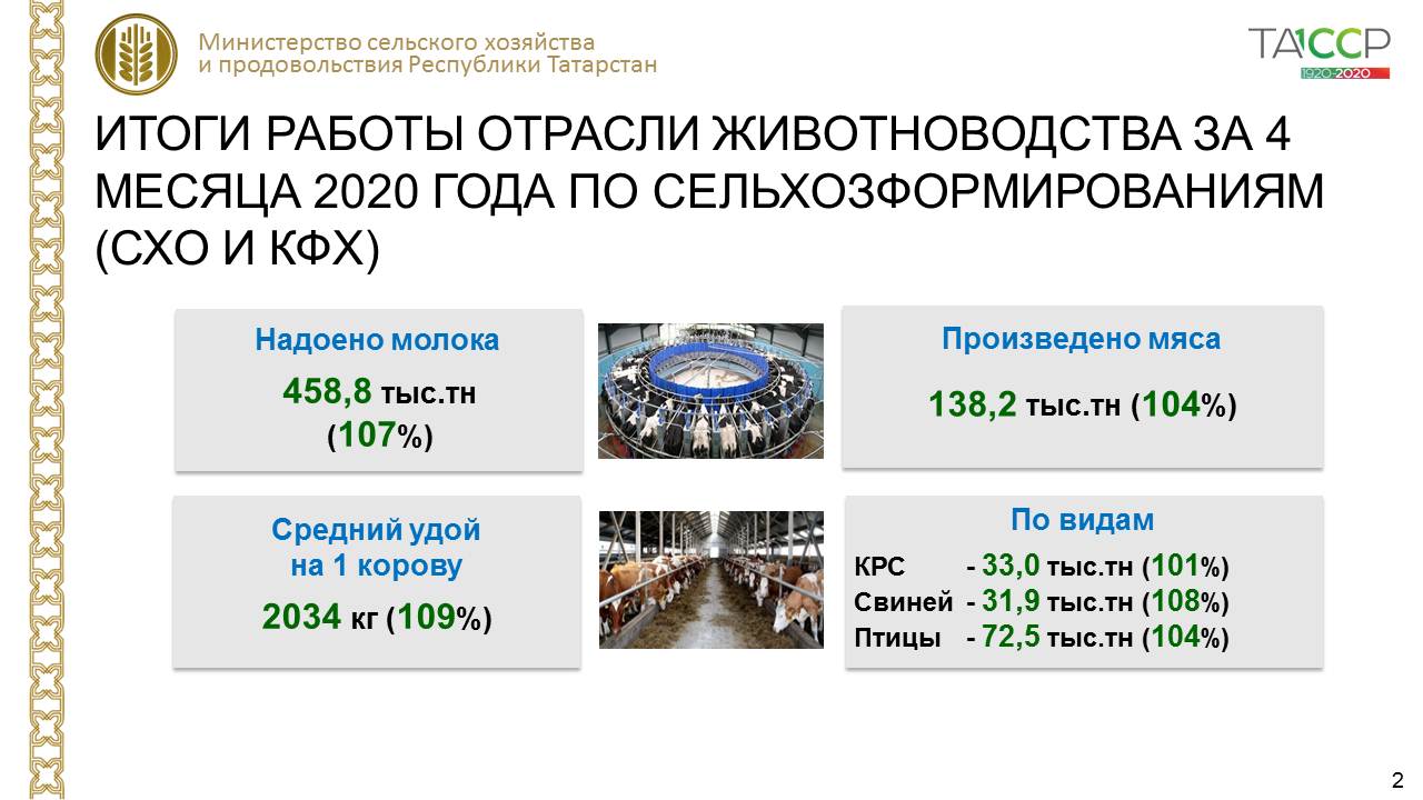 В ходе мероприятия заместитель министра Ленар Гарипов доложил, что за 4 месяца текущего года произведено 459 тыс. тн молока, с ростом 7% к прошлому году, с продуктивностью 2034 кг, выращено мяса 138 тыс.тн. или 104% в соотношении с прошлым годом. План на 2020 год по надою молока на корову составляет 6500 кг. Для реализации этого показателя определены конкретные показатели по потребности животных в кормах.