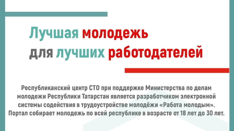 Министерство по делам молодежи Республики Татарстан совместно с Республиканским центром студенческих трудовых отрядов запустили электронную систему содействия в трудоустройстве молодежи «Работа молодым».