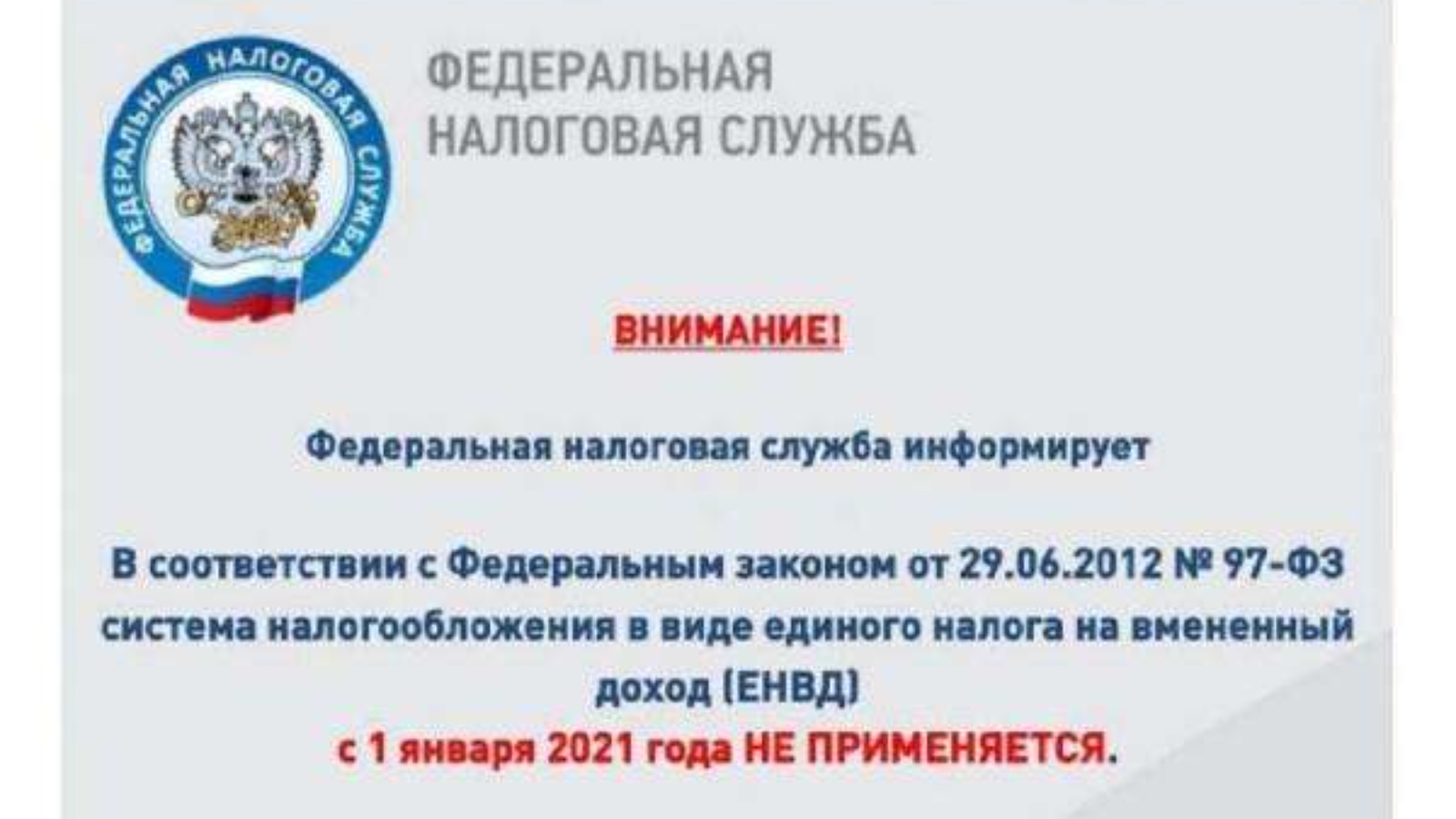 В соответствии с Федеральным законом от 29.06.2012 № 97-ФЗ система налогообложения в виде единого налога на вмененный доход (ЕНВД) с 1 января 2021 года не применяется.