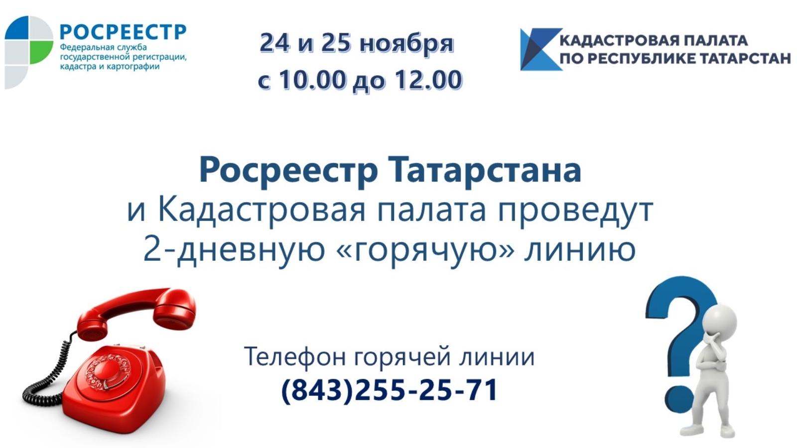 Кадастровая палата по Республике Татарстан совместно с Управлением Росреестра по Республике Татарстан проконсультирует жителей республики по вопросам кадастрового учета и регистрации прав.
