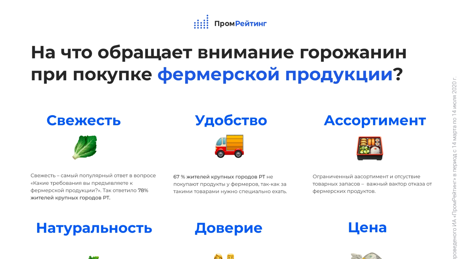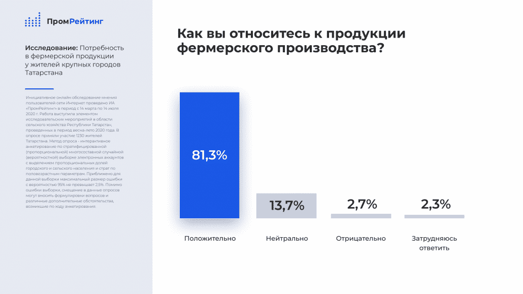 В целом более 80% опрошенных горожан из Татарстана заявили о своем положительном отношении к фермерской продукции, которую считают экологически чистой и более натуральной в отличие от той, что продается в магазинах (опрос также показал, в каких именно магазинах чаще закупаются горожане, пополняя свою продуктовую корзину).