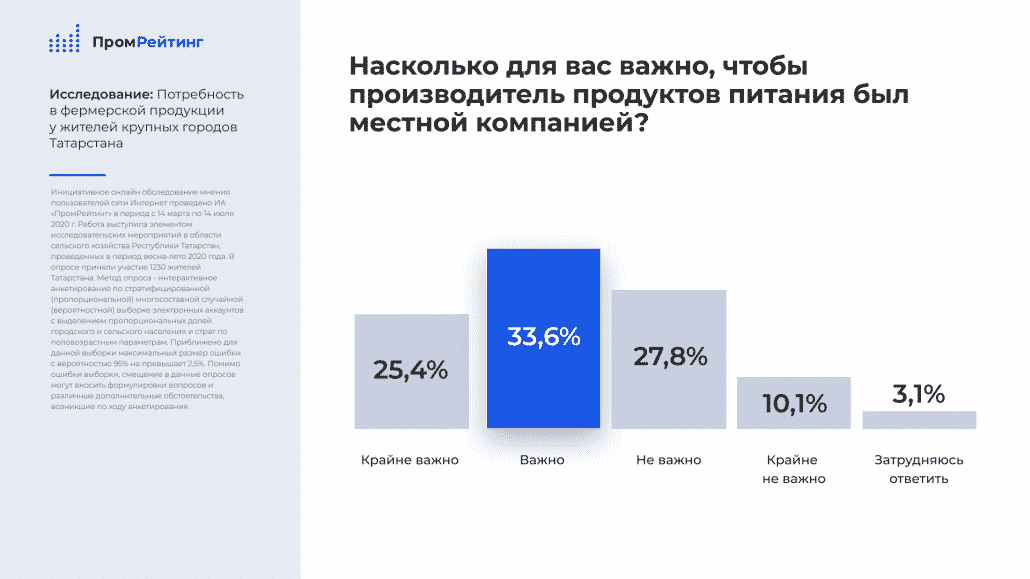 В последнее время у населения крупных городов Татарстана растет интерес к натуральной фермерской продукции, которая не продается в популярных магазинах. Согласно исследованиям, проведенным в Татарстане агентством «ПромРейтинг» при поддержке Минсельхозпрода РТ, для 33,6% жителей нашей республики важно, чтоб производитель продуктов питания был местной компанией, а для 25,4% населения даже – крайне важно!