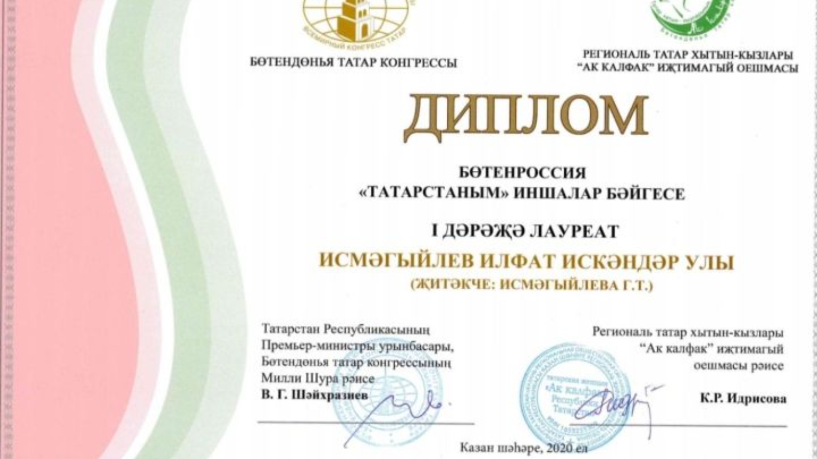 Оргкомитетом принято 56 сочинений, по положению конкурса для лучших были предусмотрены и специальные призы. Из принятых руководителем организации "Ак калфак" Нурией Гайнулловой работ высокую оценку получили три. Студент 1 курса Буинского ветеринарного техникума Исмагилов Ильфат Искандерович занял первое место. Он награждён Дипломом и ценным призом. Ханмурзина Нафиса Сайдашевна из Большефроловской школы заняла 3 место. Награждена Дипломом и серебряными серёжками. Гайсина. Алина Рамилевна из лицея-интерната удостоилась звания дипломанта, награждена Дипломом, серебряной цепочкой с кулоном.