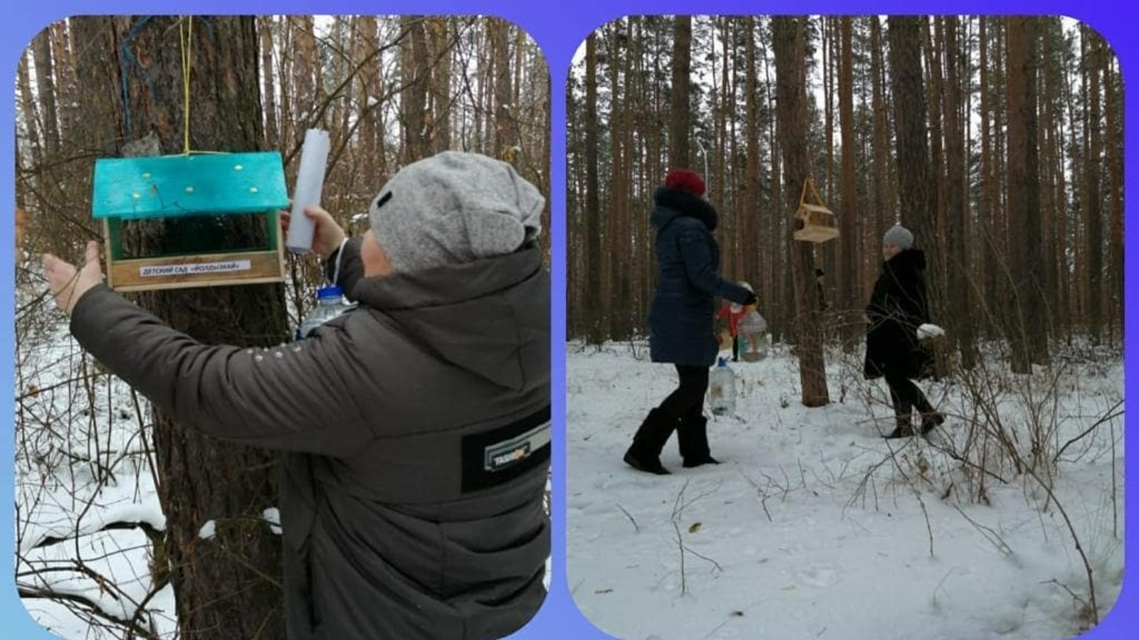 Зима – трудное время для птиц, особенно если она суровая и многоснежная. Много пернатых погибает от холода и голода. Чтобы как-то помочь птицам, воспитанники детского сада "Йолдызкай" совместно с родителями изготовили кормушки -маленькие столовые для птиц . Сотрудники ДОУ провели экологическую акцию «Покормите птиц зимой» развесили кормушки на участке детского сада и в сосновом бору.