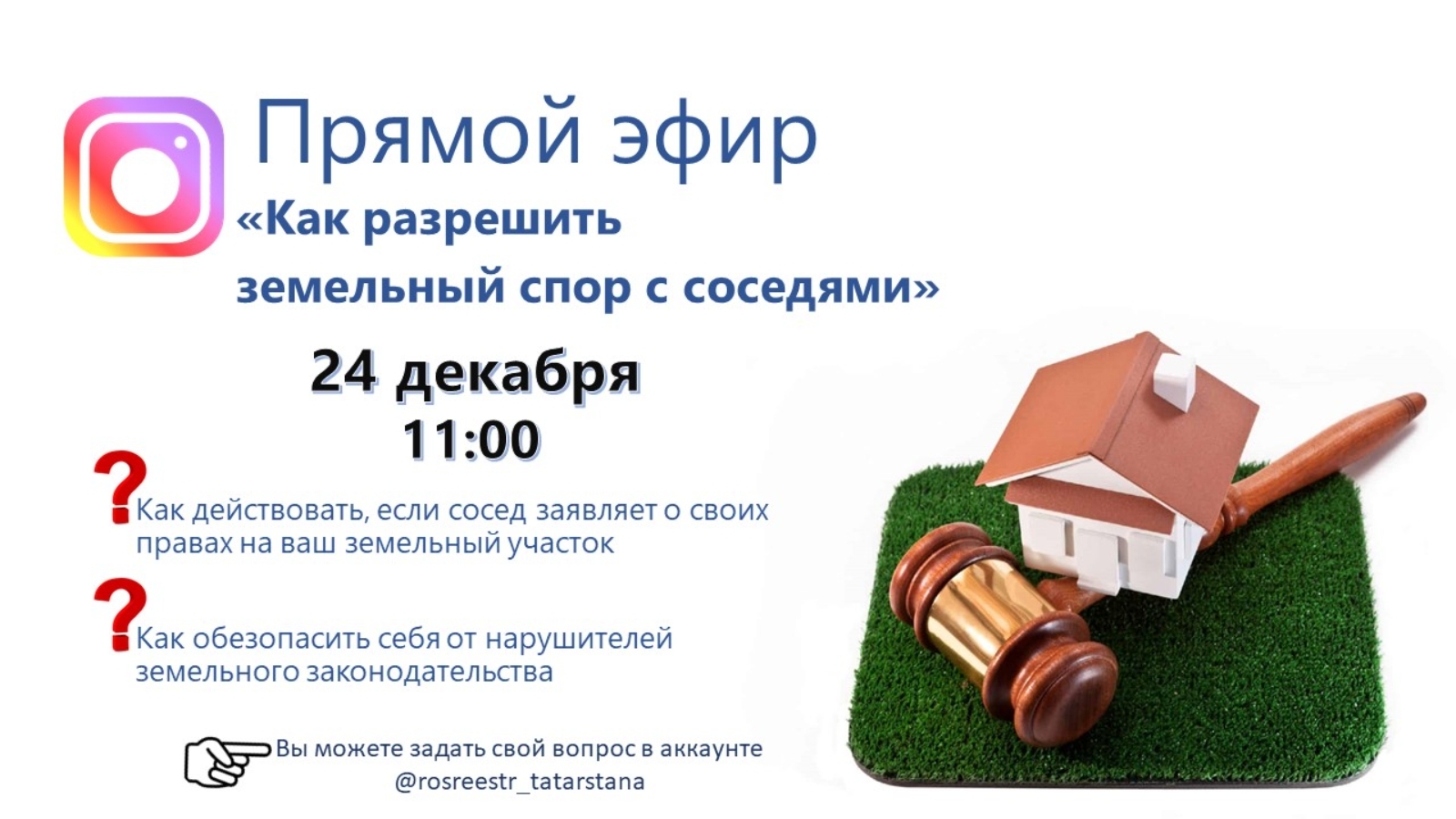 24 декабря в 11.00 Управление Росреестра по Республике Татарстан проведёт в Инстаграм прямой эфир по вопросам нарушения земельного законодательства.