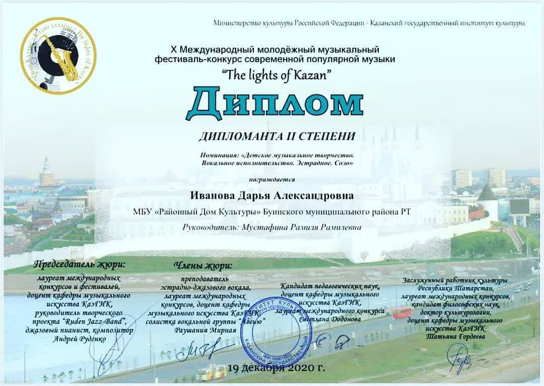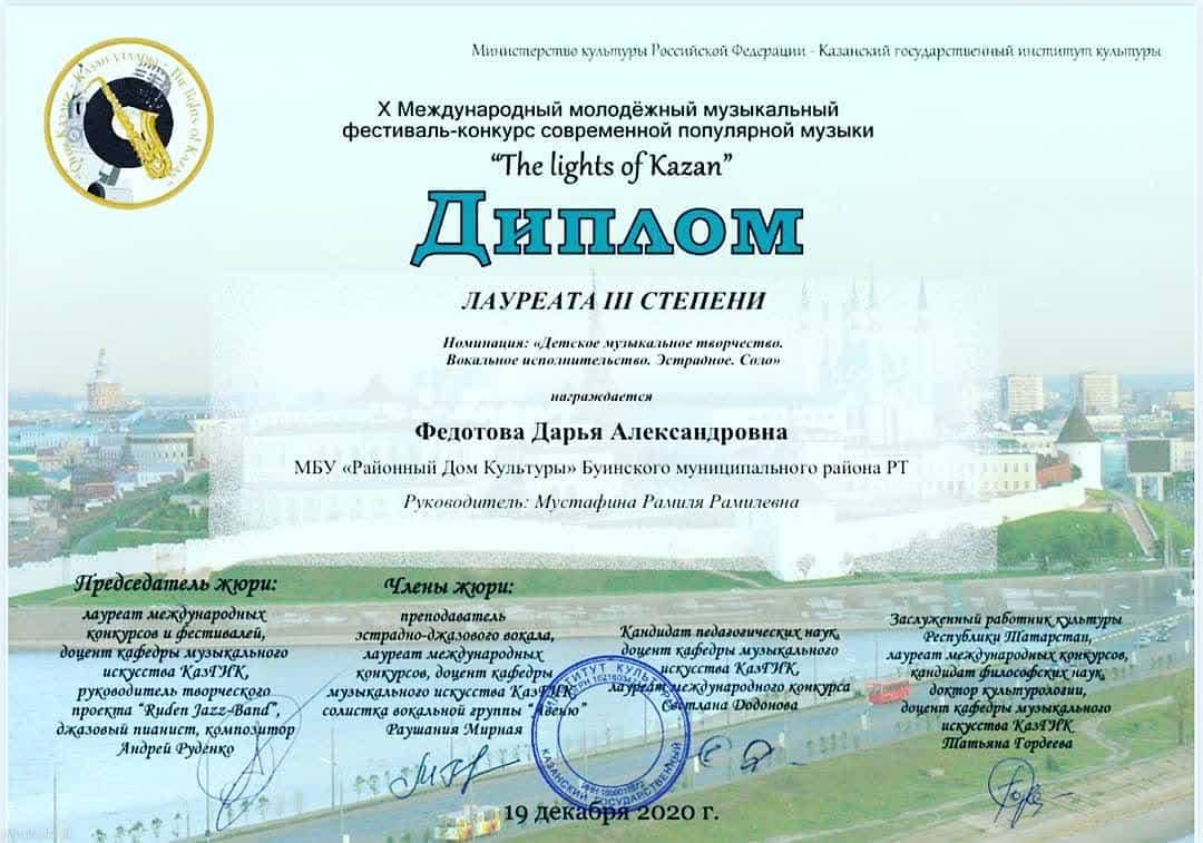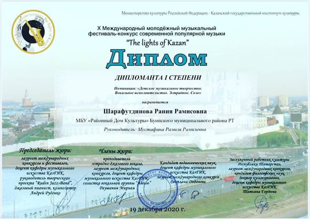 19 декабря 2020 года в Казанском государственном институте культуры прошел X Международный молодёжный музыкальный фестиваль-конкурс исполнителей современной популярной музыки «The lights of Kazan» («Огни Казани - «Казан утлары»). Конкурс проводился в один тур по видеозаписям, отправленным участниками в Оргкомитет конкурса. Буинск представили на конкурсе воспитанники студии эстрадного вокала «Kids time» районного дома культуры buinskrdk , под руководством Мустафиной Рамили Рамилевны. Юные вокалисты Рамина Махмутова, Дарья Федотова, Рания Шарафутдинова, Дарья Иванова и Регина Шарафутдинова уже неоднократно принимали участие и становились победителями конкурсов разного уровня. И в этот раз наших воспитанников ждал успех. Наши юные таланты стали лауреатами и дипломантами фестиваля – конкурса. Такое успешное выступление стало, конечно же, результатом долгой и усердной работы юных дарований, профессионального мастерства педагога и поддержки родителей!