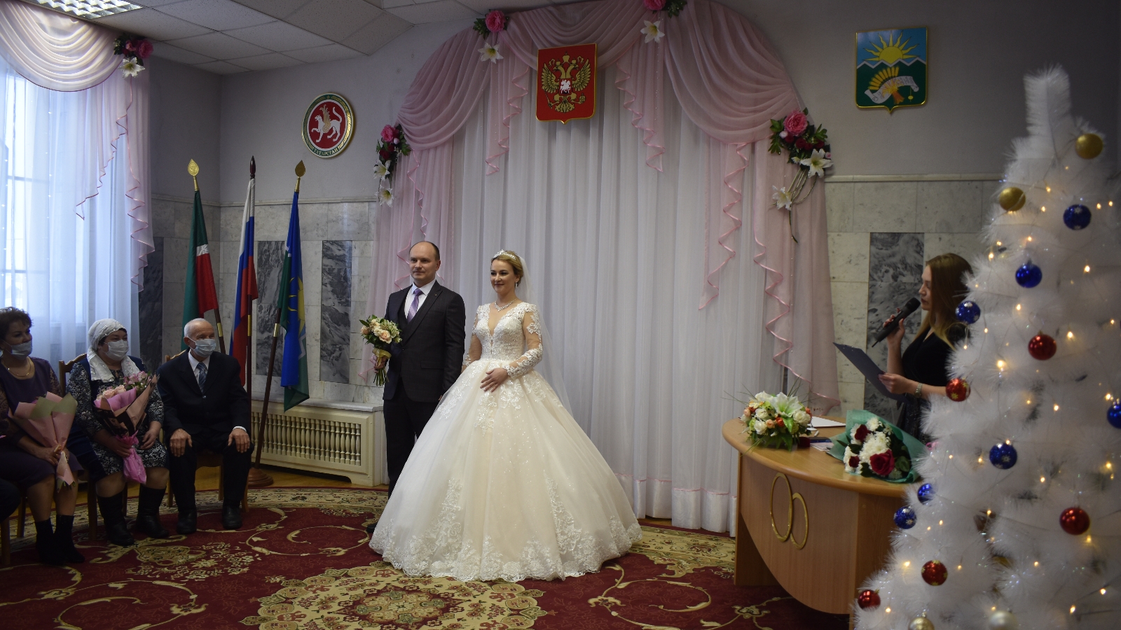 В торжественной церемонии регистрации принял участие заместитель руководителя исполнительного комитета Фанис Мифтахов. В поздравительном обращении к молодоженам Фанис Фаризович пожелал им мира, счастья, крепкой взаимной любви, согласия и взаимопонимания. На память молодоженам об этом событии вручили подарки и цветы.