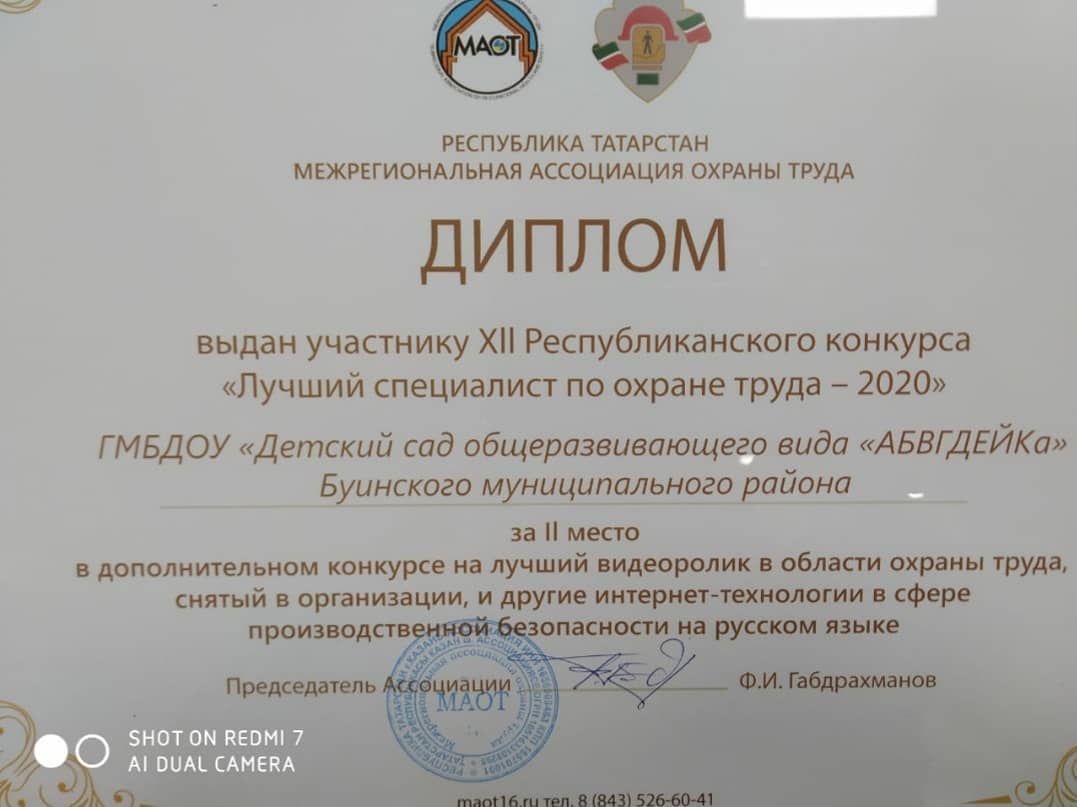 Детский сад "АБВГДЕЙКа" принял участие в XII Республиканском конкурсе "Лучший специалист по охране труда-2020" и занял II место в дополнительном конкурсе на лучший видеоролик в области охраны труда, снятый в организации, и другие интернет-технологии в сфере производственной безопасности на русском языке. Поздравляем коллектив МБДОУ " АБВГДЕЙКа" и желаем дальнейших творческих успехов!