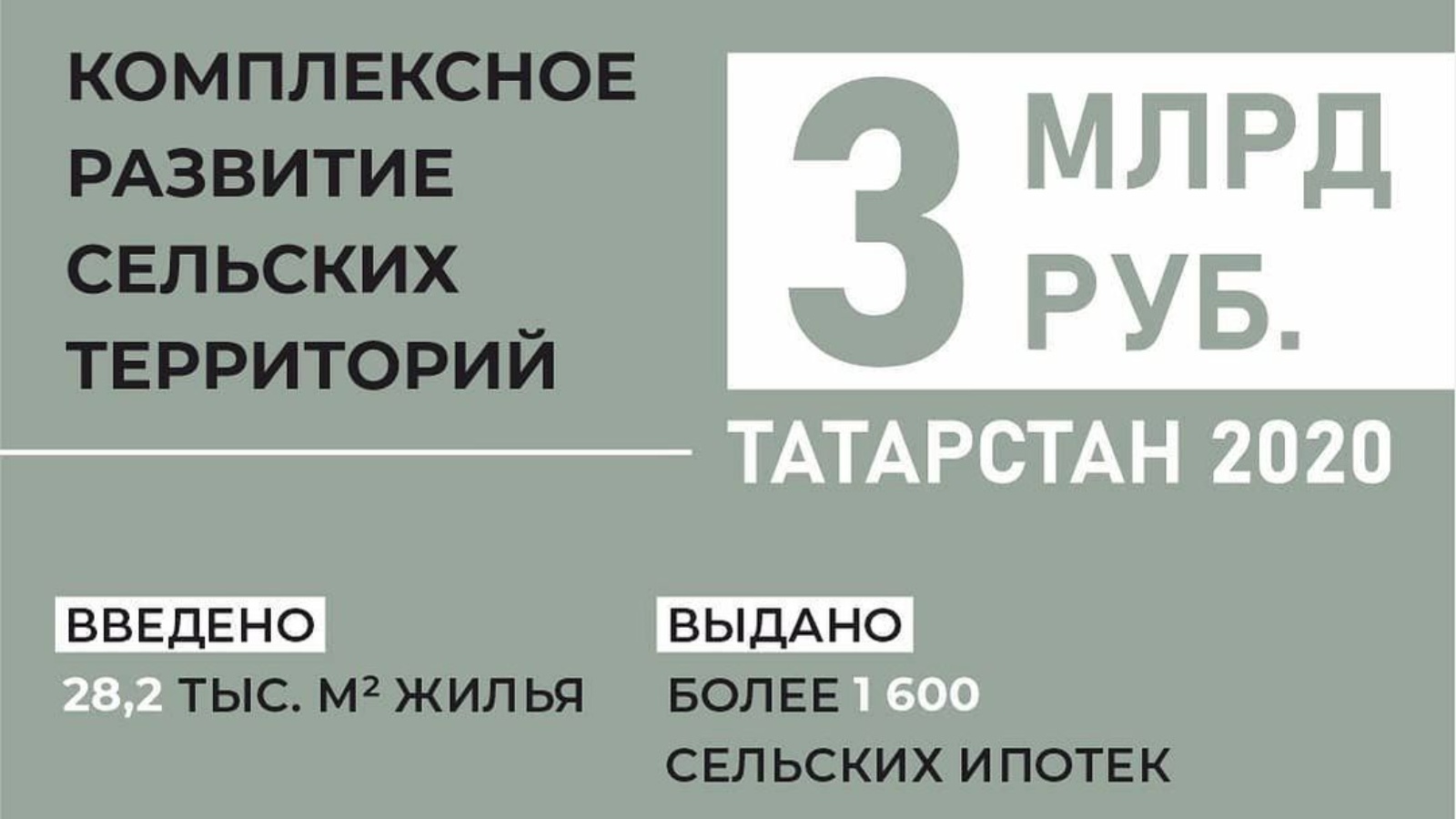 За первый год реализации программы комплексного развития сельских территорий в Татарстане удалось ввести в эксплуатацию 28,2 тыс.кв.м и обеспечить жильём 406 семей. Построено 6,86 км газораспределительных и 24 км водопроводных сетей. Реализовано 500 проектов по благоустройству сельских территорий: спортивные и детские площадки, зоны отдыха и т.д.Эффективным инструментом улучшения жилищных условий стала программа «Сельской ипотеки» со ставкой 3% годовых. Татарстан вошёл в число регионов-лидеров по объему ее выдачи, обеспечив более 1600 семей средствами на приобретение жилья на сельских территориях. Министерство сельского хозяйства и дальше планирует активно работать по комплексному развитию сельских территорий. В мероприятиях могут принять участие все районы республики. Уточнить условия госпрограммы можно в нашем колл-центре: 8-800-444-16-70.
