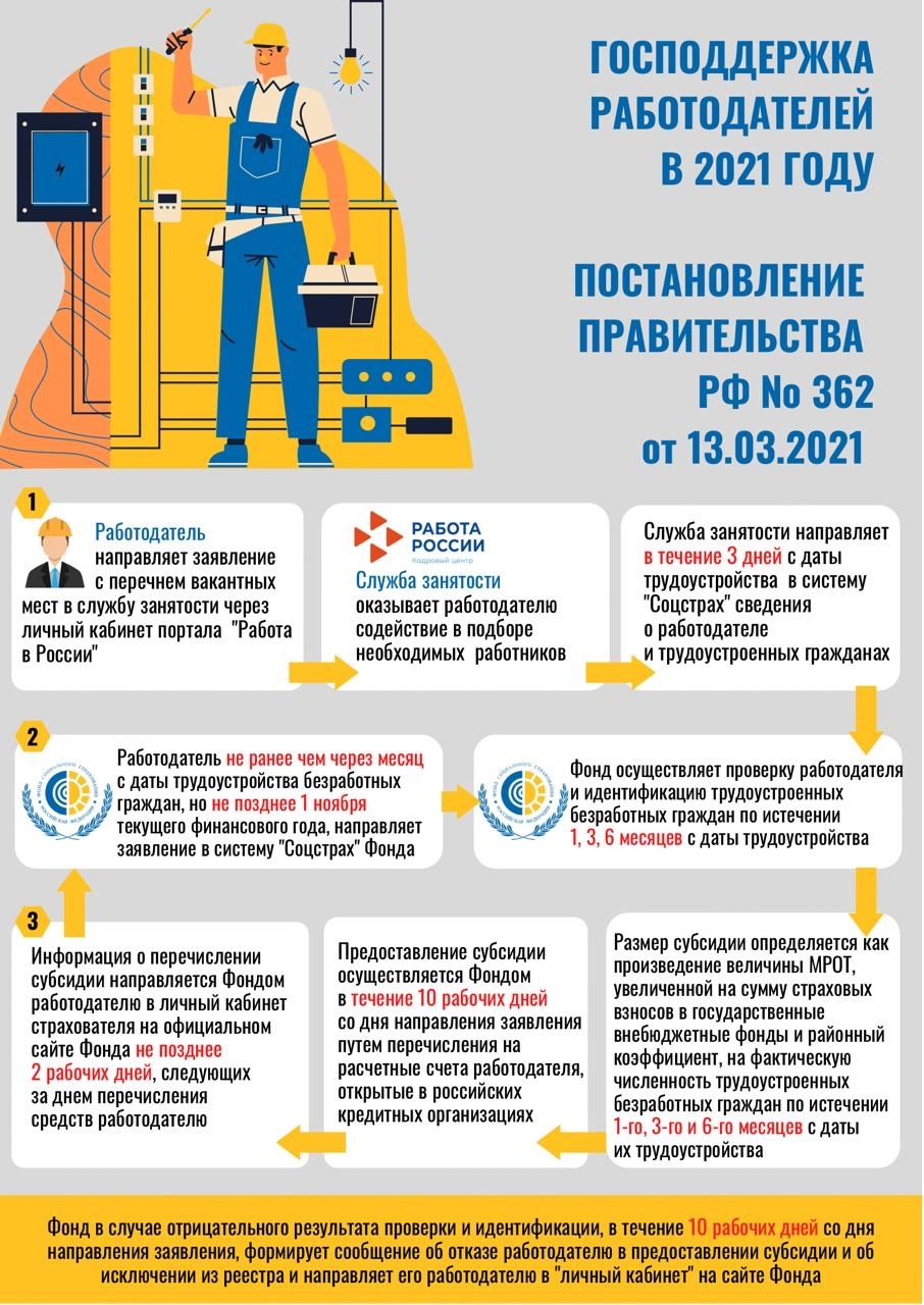 В соответствии с Постановлением Правительства РФ от 13 марта 2021 г. № 362 "О государственной поддержке в 2021 году юридических лиц и индивидуальных предпринимателей при трудоустройстве безработных граждан" работодатели смогут получить господдержку при трудоустройстве граждан, которые были зарегистрированы в центрах занятости до 1 января 2021 года.