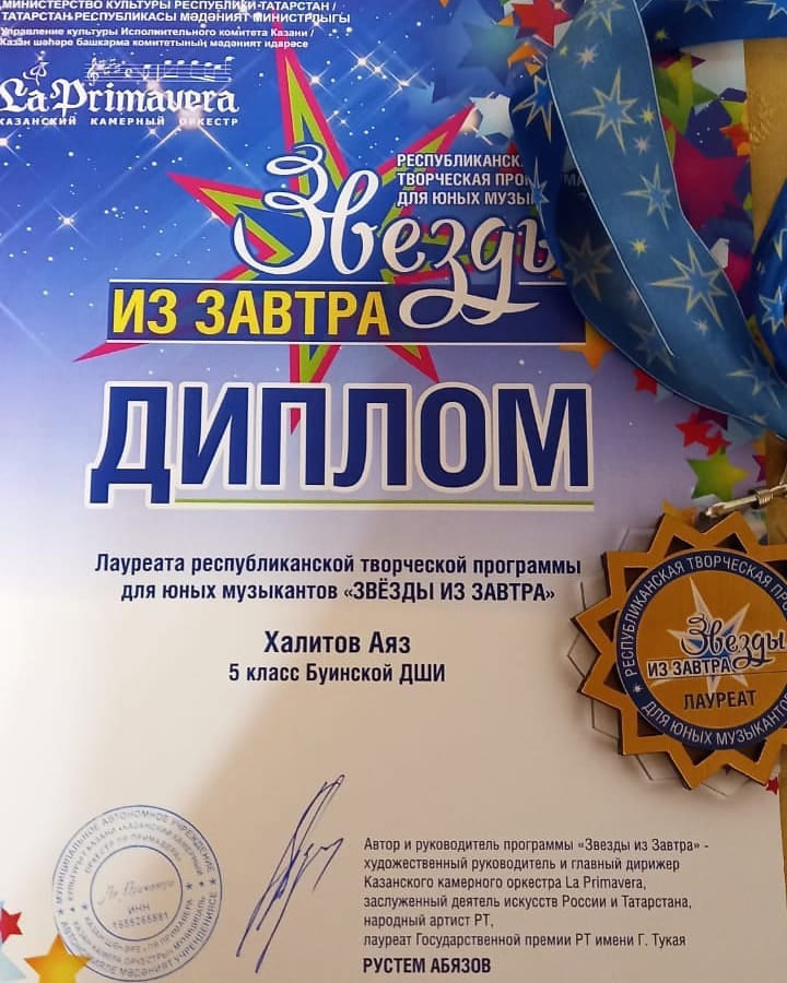 В апреле 2021 года обучающийся гимназии имени М. М. Вахитова, ученик Буинской ДШИ Халитов Аяз, стал лауреатом республиканской творческой программы для юных музыкантов "ЗВЁЗДЫ ИЗ ЗАВТРА". Автором и руководителем программы является художественный руководитель и главный дирижёр Казанского камерного оркестра La Primavera, заслуженный деятель искусств России и Татарстана, народный артист РТ, лауреат Государственной премии РТ имени Г. Тукая Рустем Абязов. Он ежегодно проводит прослушивание детей, по итогам которых формируется программа гала-концерта. Ребята выступают в сопровождении Казанского камерного оркестра La Primavera.