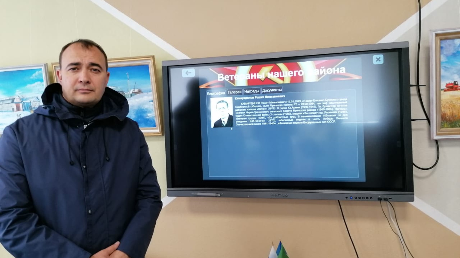 Сегодня, 4 мая Глава Буинского муниципального района Ранис Камартдинов посетил краеведческий музей, где ознакомился с процессом работы над программой «Электронная книга ветеранов Буинского муниципального района». Ранис Рафисович, сам оценил работу программы, лично задав поиск фамилии своего деда участника Великой Отечественной войны - Камартдинова Рашита Мингалиевича. В результате поиска на экране появилась вся информация с фотографией и автобиографией его предка.