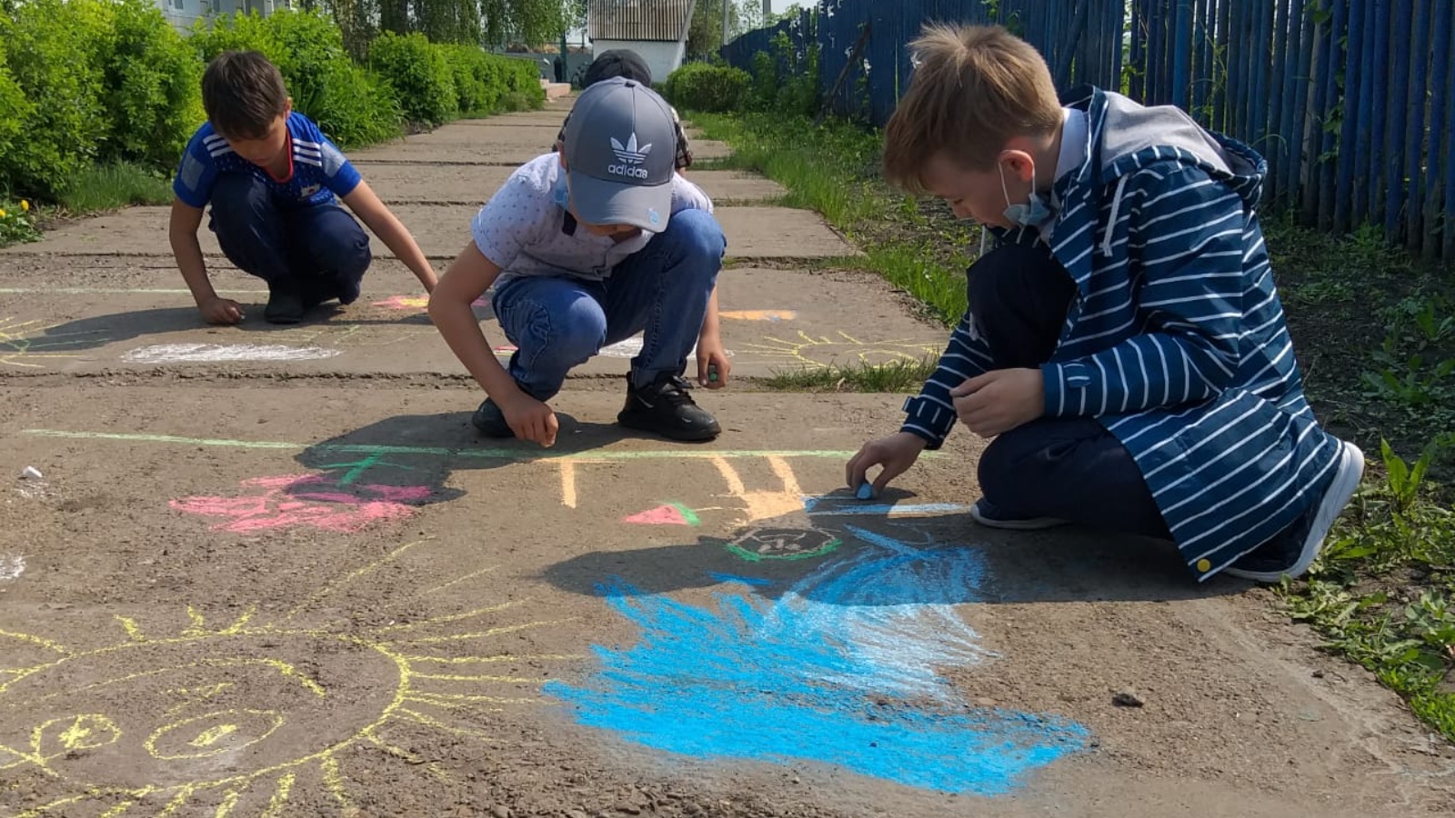 Дети рисовали цветы, бабочек, желтое солнце, а в синем небе парил воздушный шар. Асфальт расцветал удивительными красками. Дети очень старались, аккуратно раскрашивая свои рисунки. Никто не скучал, все были заняты творчеством.