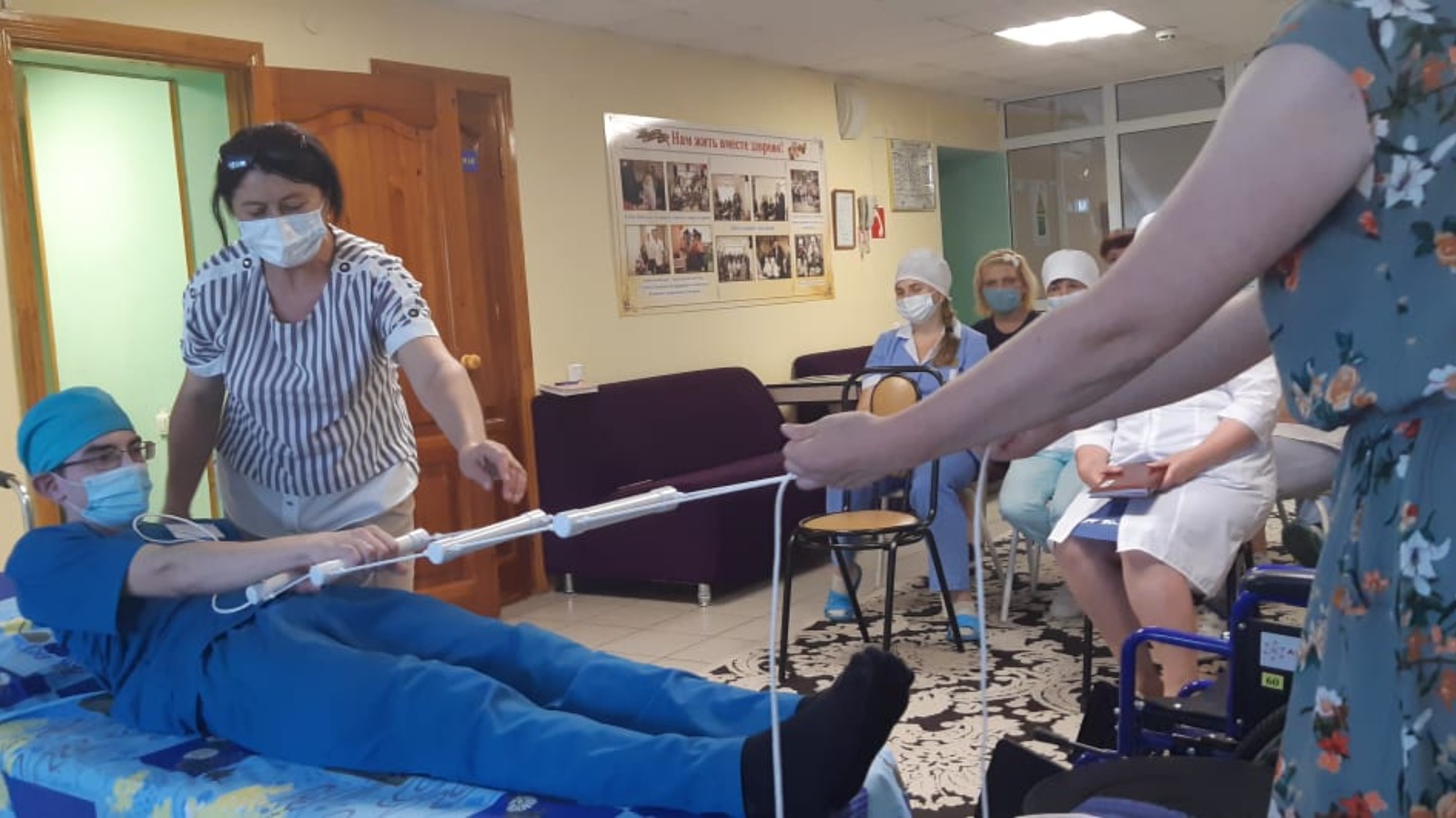 В практической части специалисты показали транспортировку и перекладывания тяжелобольного с помощью средств реабилитации, в теоретической части рассказали о профилактике пролежней, позиционирование при кормлении лежачего больного.
