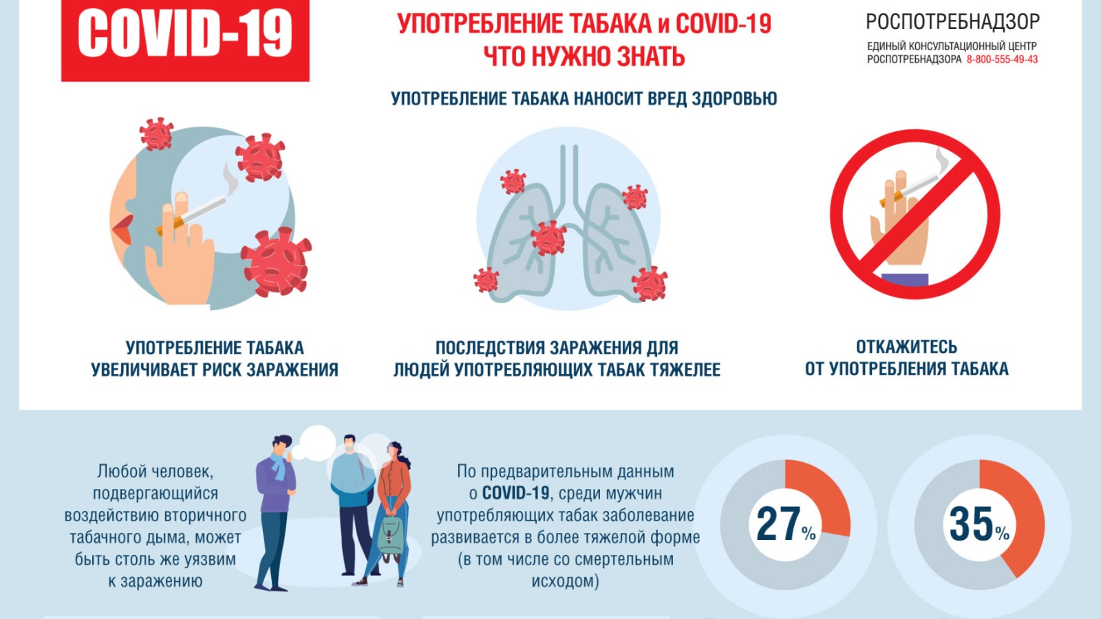 Роспотребнадзор призывает граждан защитить свое здоровье от разрушительных последствий употребления табака и выполнять рекомендации врачей в контексте предпринимаемых мер по борьбе с COVID-19.