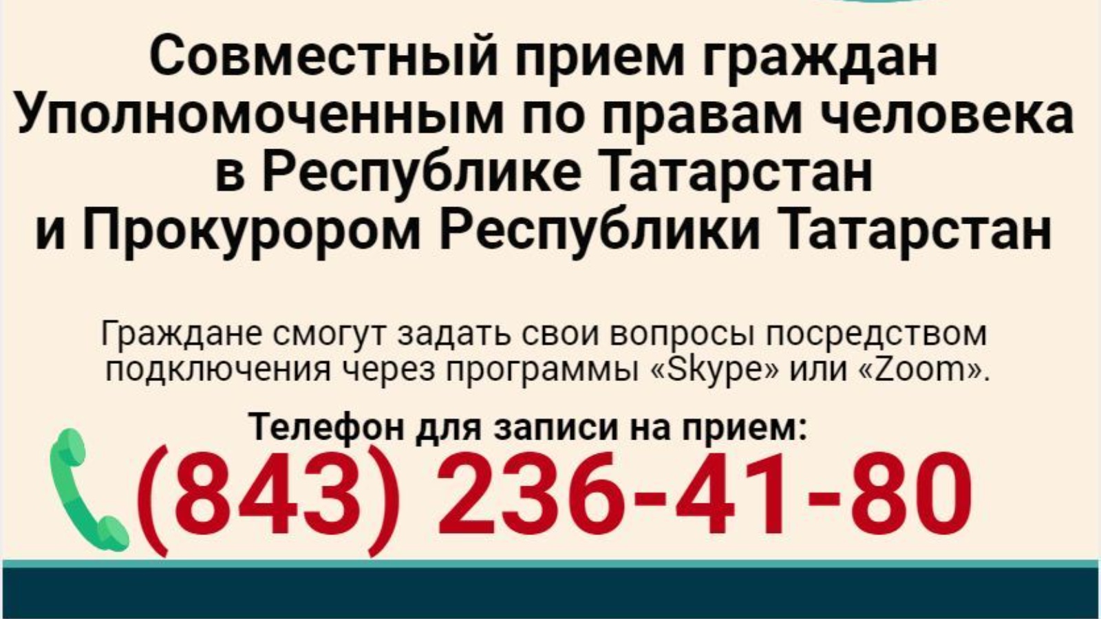 08 июня 2021 года в Аппарате Уполномоченного по правам человека в Республике Татарстан (г. Казань, ул. Карла Маркса, д. 61) состоится совместный прием граждан Уполномоченным по правам человека в Республике Татарстан и Прокурором Республики Татарстан. Также у жителей муниципальных районов республики будет возможность задать свои вопросы Сарие Сабурской и Илдусу Нафикову посредством прямого подключения через программу «Skype» в приемных общественных помощников Уполномоченного по правам человека в Республике Татарстан в муниципальных образованиях республики. Необходима предварительная запись по телефону (843) 236-41-80 (приемная Уполномоченного по правам человека в Республике Татарстан).