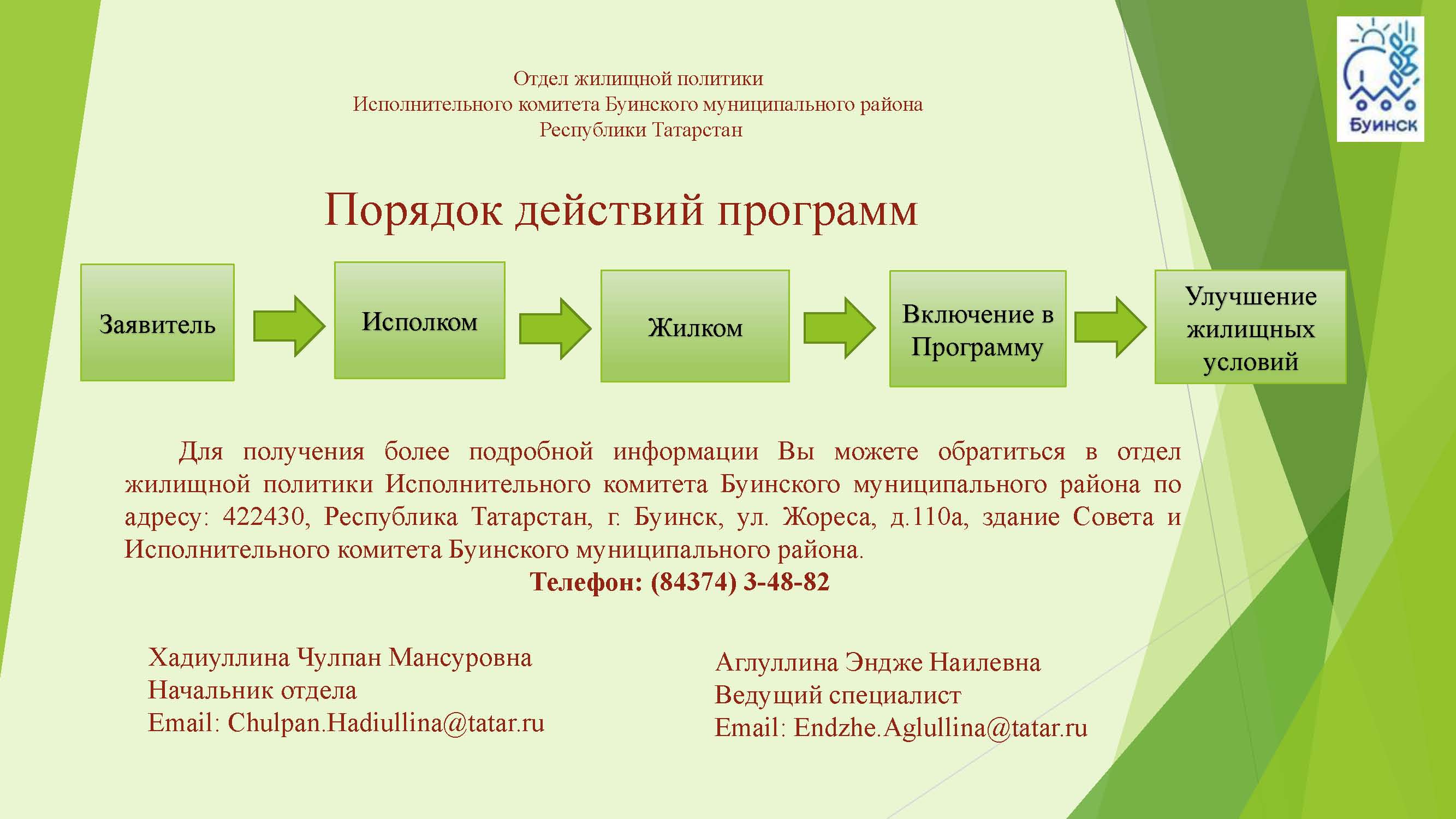 Для получения более подробной информации Вы можете обратиться в отдел жилищной политики Исполнительного комитета Буинского муниципального района по адресу: