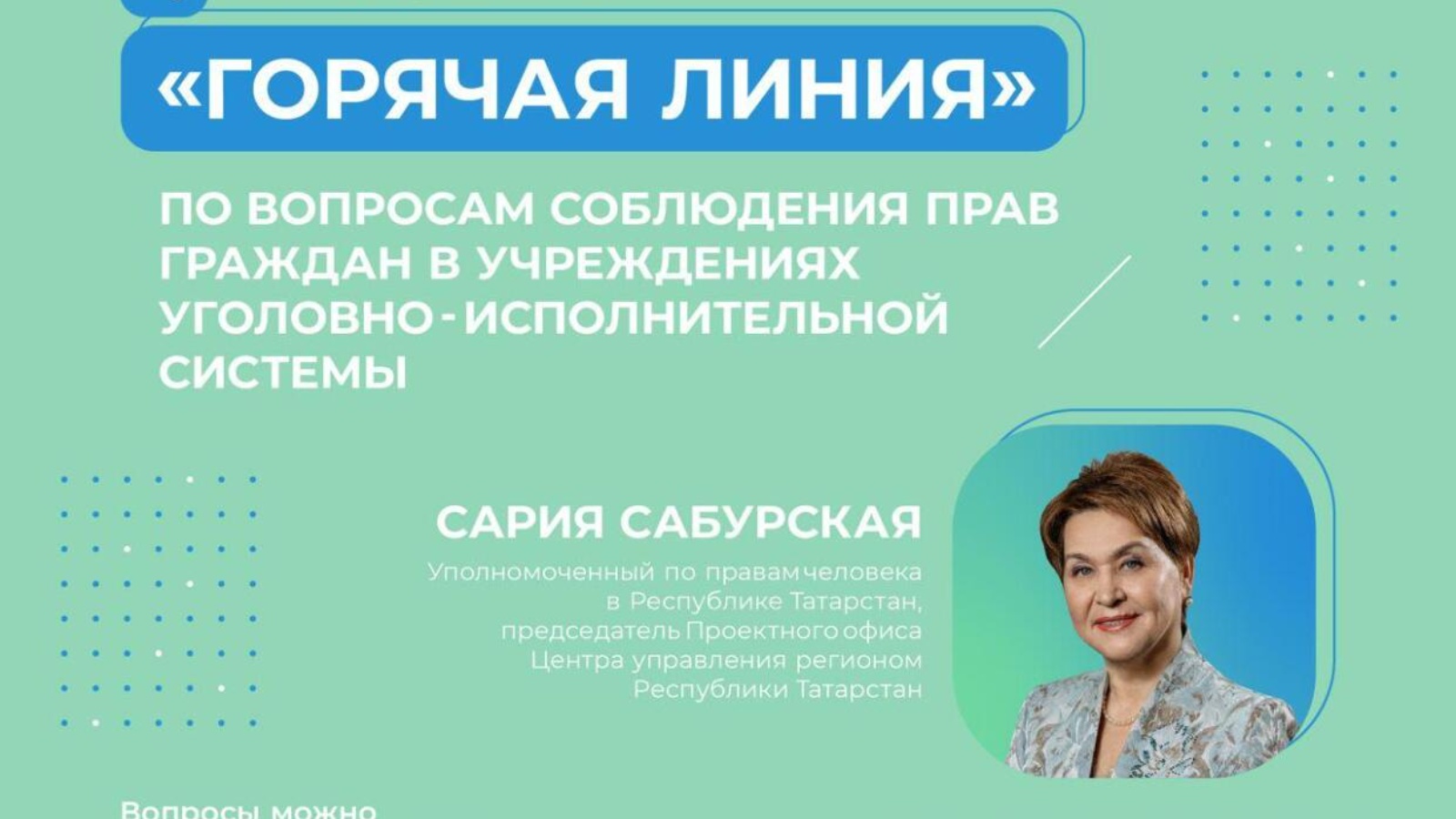29 июля 2021 года, Уполномоченный по правам человека проводит «горячую линию» по вопросам соблюдения прав граждан с ограниченными возможностями здоровья. Получить исчерпывающую информацию, правовую консультацию, разъяснить спорные ситуации гражданам помогут представители Аппарата Уполномоченного по правам человека в Республике Татарстан, Управления Федеральной службы исполнения наказаний Российской Федерации по Республике Татарстан, Общественной наблюдательной комиссии Республики Татарстан, Прокуратуры Республики Татарстан. Телефон «горячей линии»: (843) 236-00-71. Вы также можете направить свои вопросы в WhatsApp по номеру телефона +7 (939) 345-37-50. Время консультации: с 09.00 до 15.00