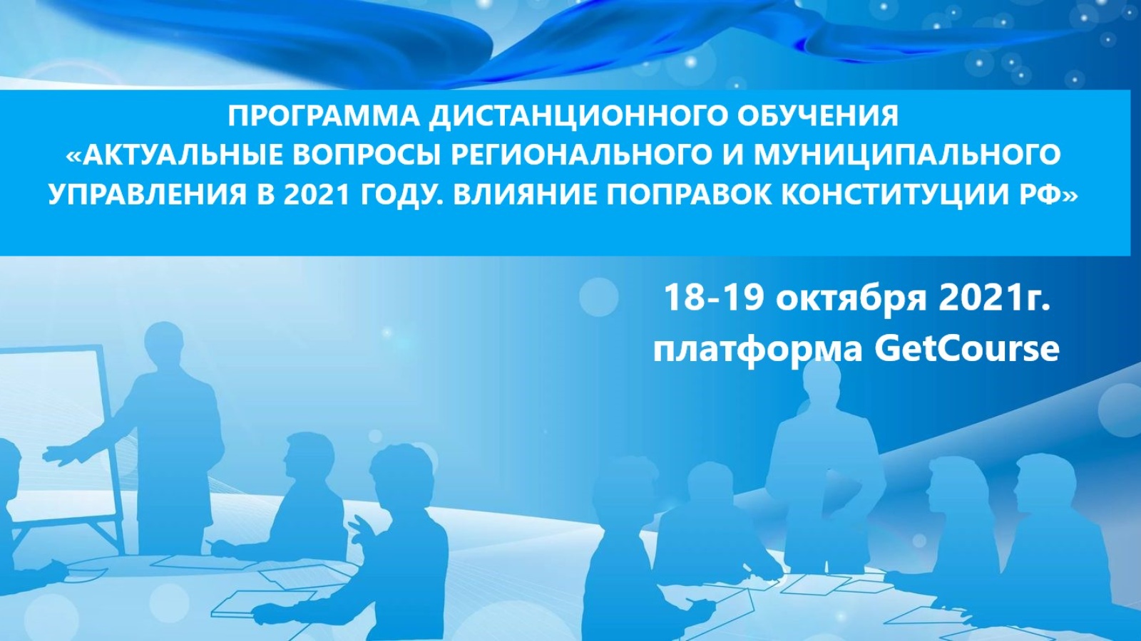 В связи с укрупнением и реорганизацией муниципальных образований и с целью разъяснения новых требований к их деятельности 18-19 октября 2021 года пройдет дистанционное обучение (повышение квалификации) «Актуальные вопросы регионального и муниципального управления в 2021 году. Влияние поправок Конституции РФ». Мероприятие будет проходить в дистанционном формате на платформе GetCourse.