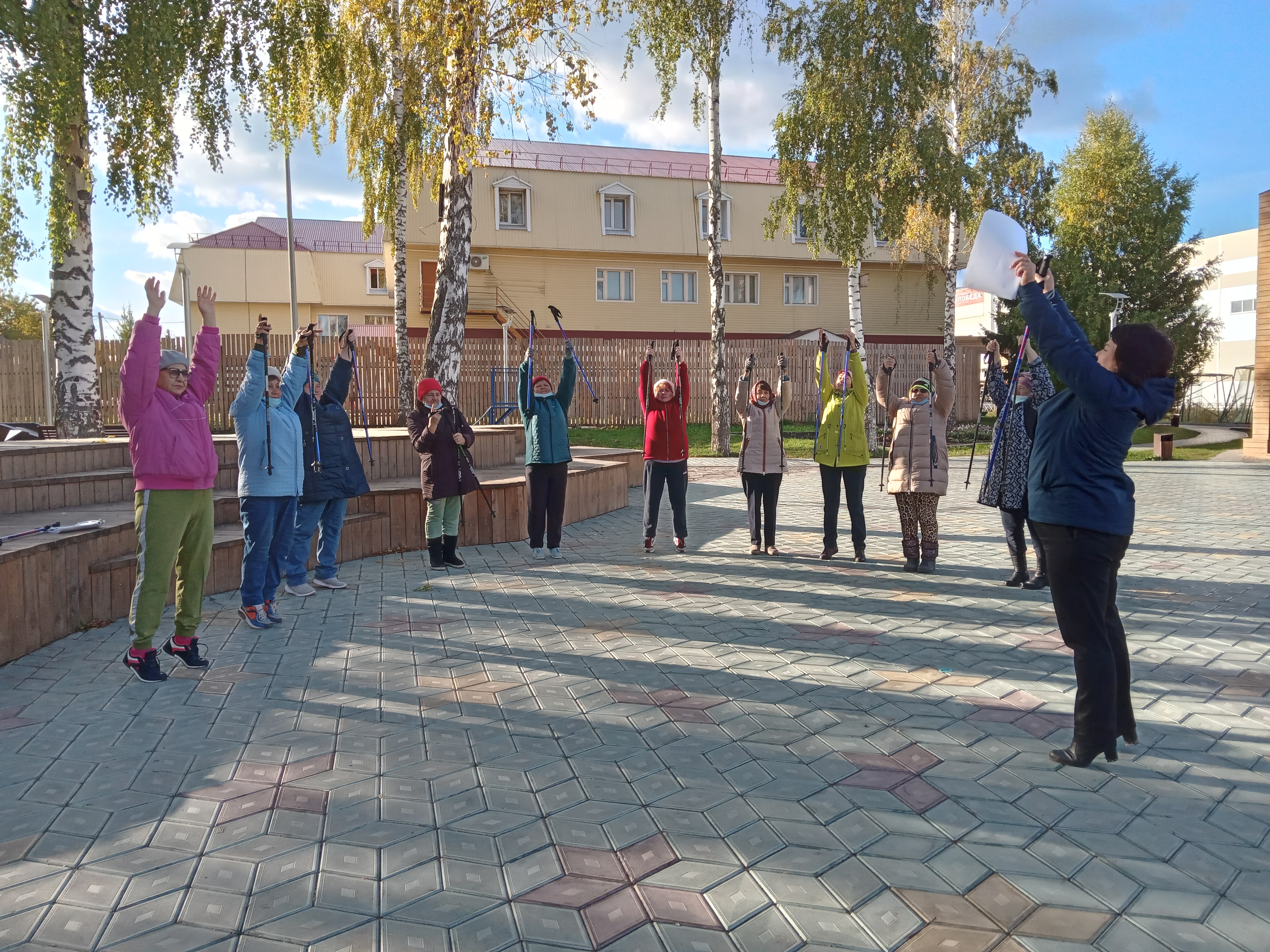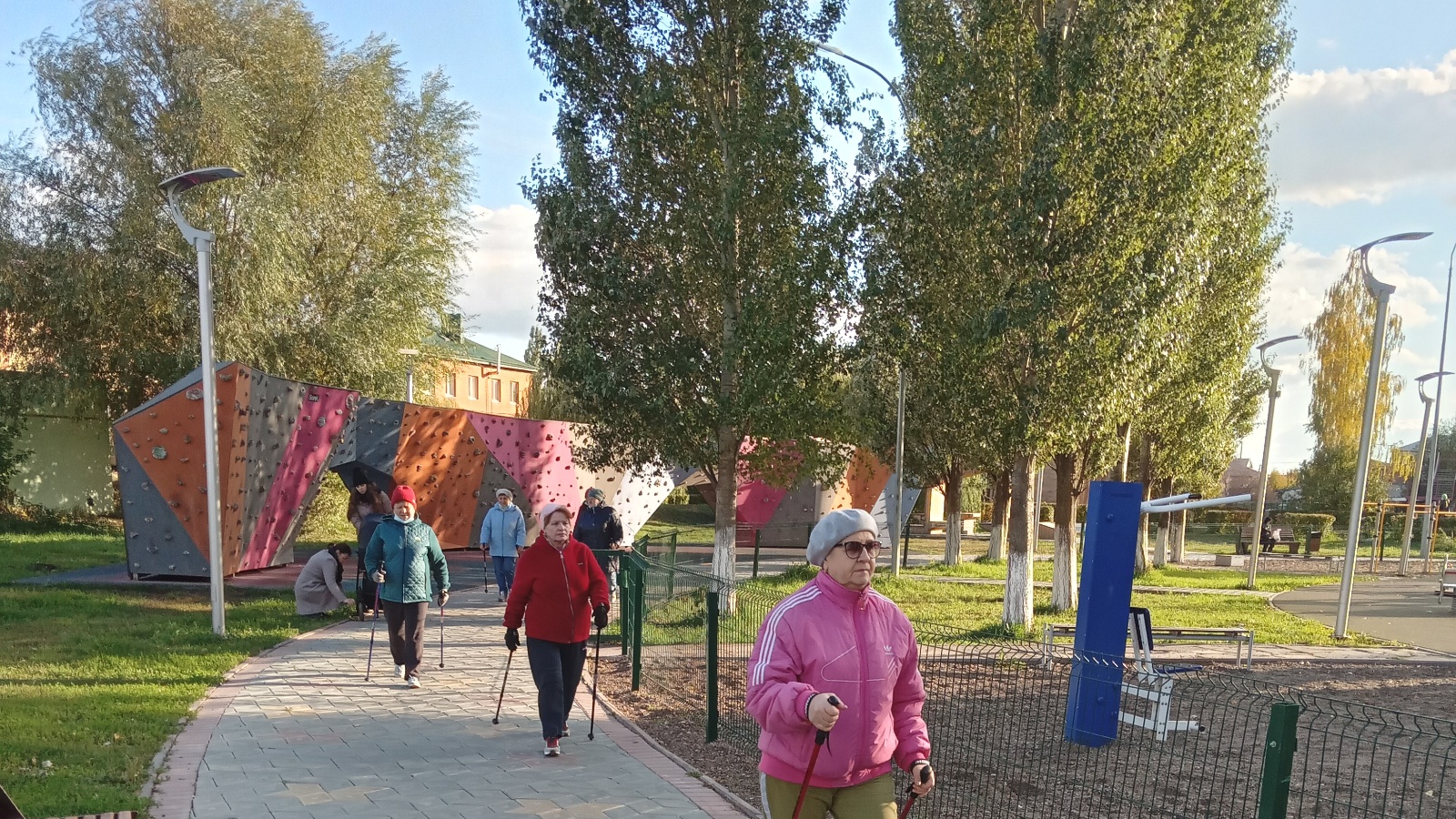 В молодежном парке собрались любители скандинавской ходьбы. В рамках мероприятия пожилым напомнили о пользе и технике скандинавской ходьбы, о том, как правильно подобрать снаряжения, сделали разминку и приступили к ходьбе с палками.
