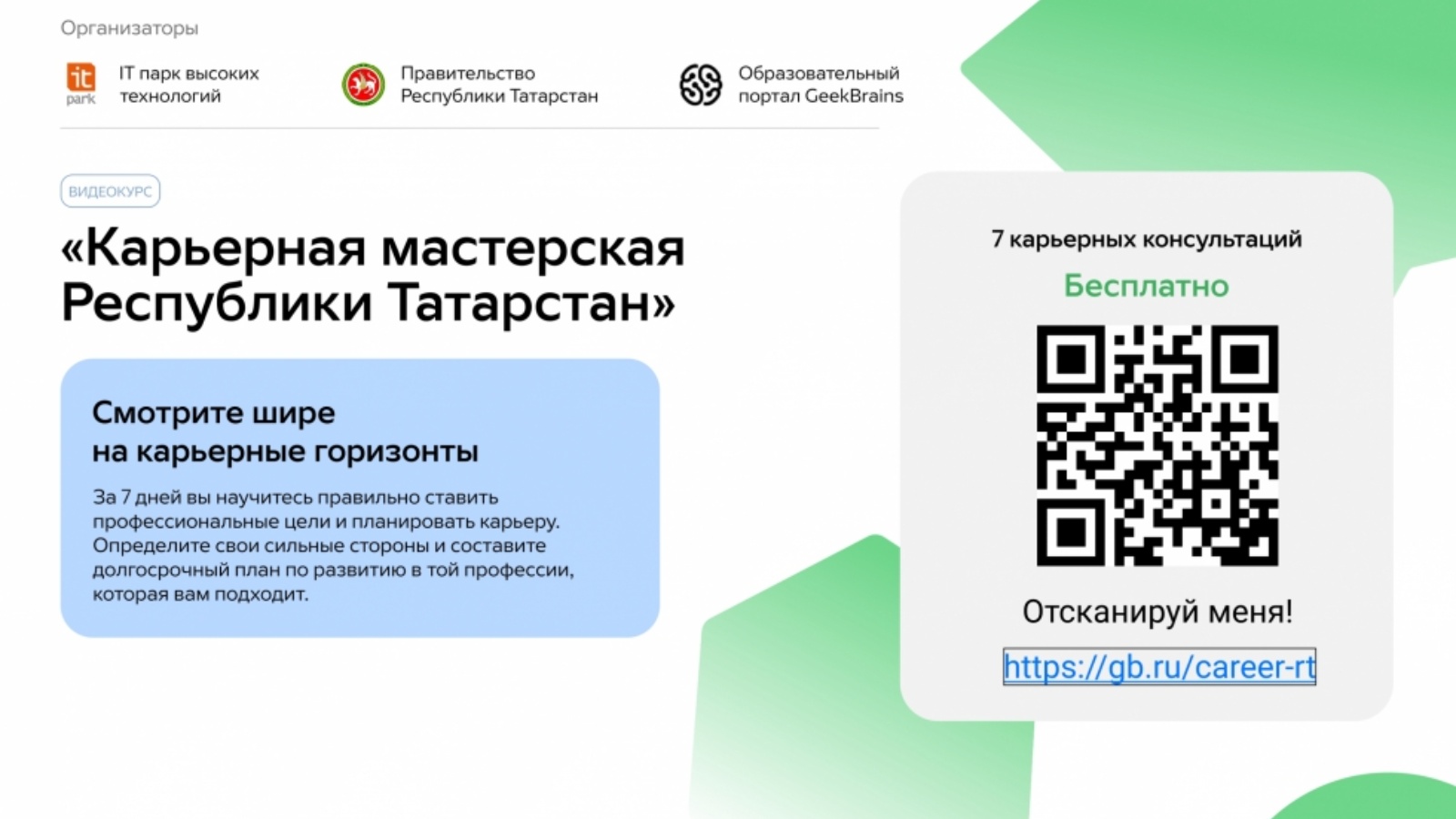 Бесплатный онлайн-курс включает в себя семь обучающих дней – слушатели курса научатся ставить профессиональные цели, планировать карьеру, определят свои сильные стороны и составят долгосрочный план по личностному развитию. Записаться на курс «Карьерной мастерской» можно в любое время на сайте программы, сообщает пресс-служба Минцифры РТ.