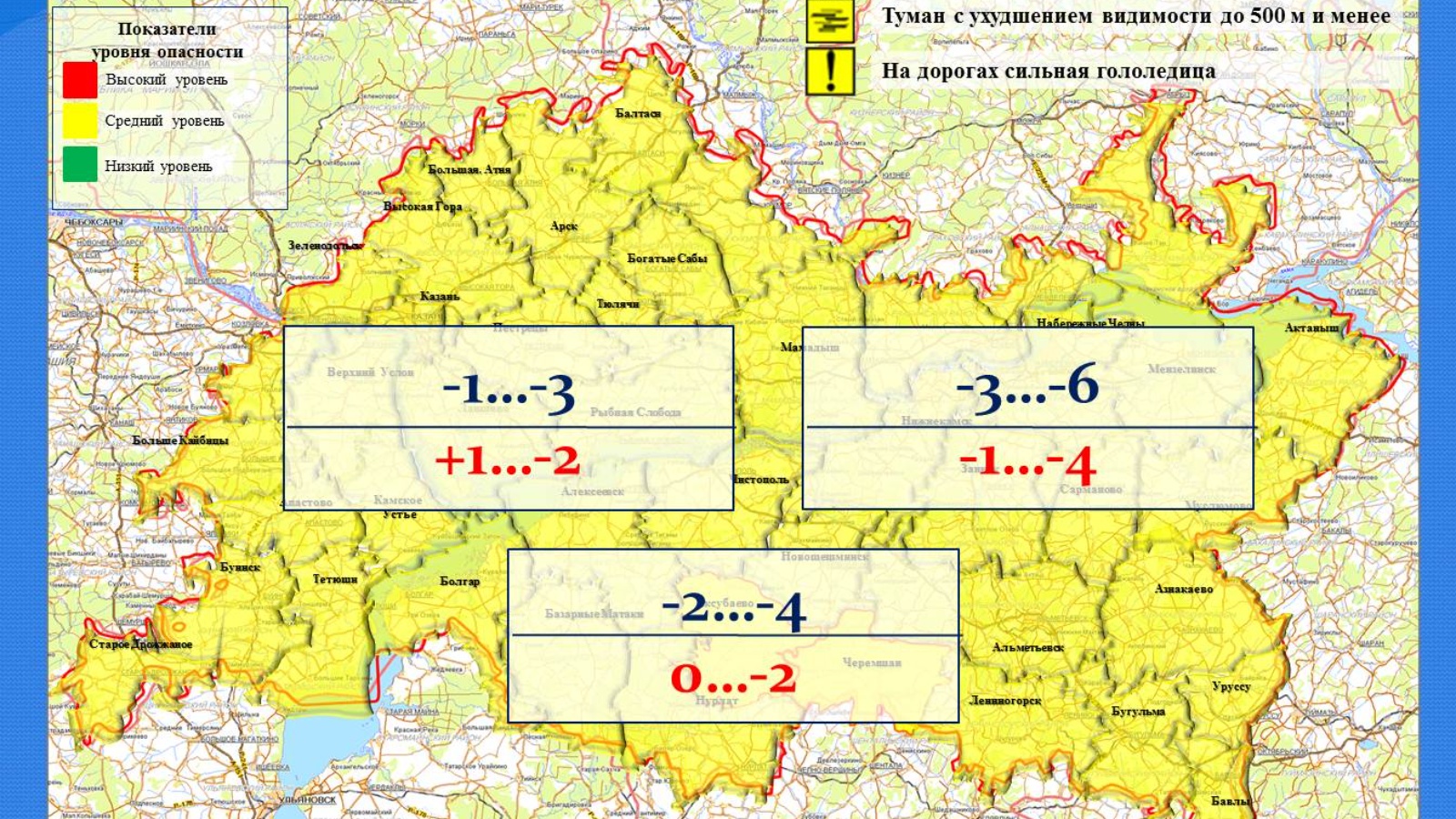 Ночью и днем 9 декабря 2021 года на территории Республики Татарстан и в городе Казани местами ожидаются: туман с ухудшением видимости до 500 метров и менее, на дорогах сильная гололедица.