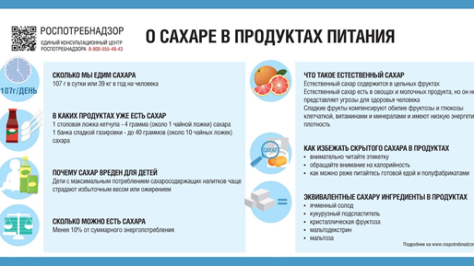 Потребление сахара в России в полтора раза ниже чем в США, на 11% выше, чем в Германии, и вдвое выше, чем в Японии. В среднем один россиянин съедает 107 г в сутки или 39 кг в год. Значительная часть сахаров, потребляемых сегодня, содержатся в переработанных пищевых продуктах, которые обычно не считаются сладостями. Например, в 1 столовой ложке кетчупа содержатся примерно 4 грамма (около 1 чайной ложки) свободных сахаров. Одна банка подслащенного сахаром газированного напитка, содержит до 40 граммов (около 10 чайных ложек) свободных сахаров.