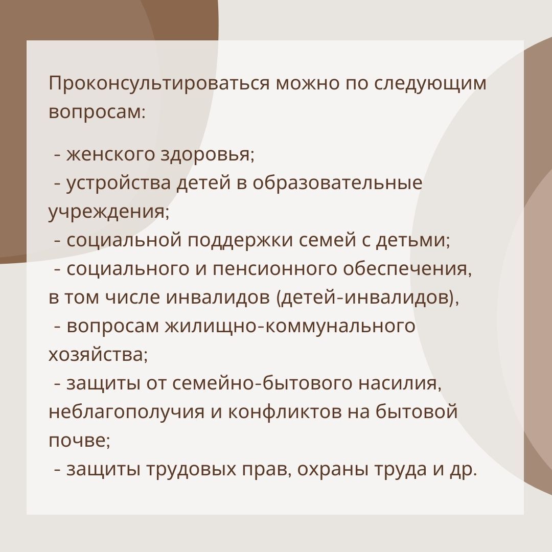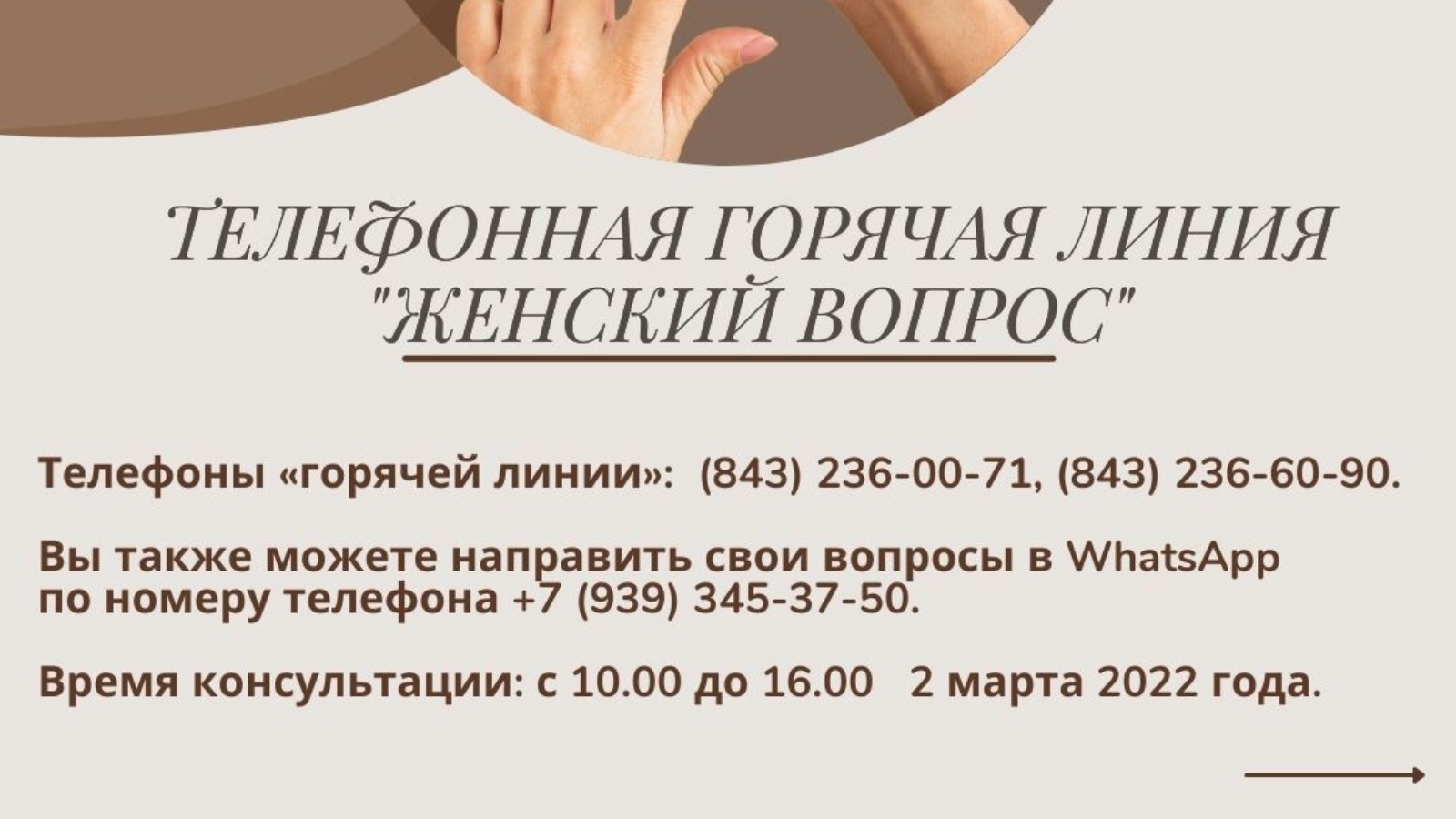 2 марта 2022 года, в преддверии международного женского дня, пройдет «горячая линия» «Женский вопрос» по вопросам защиты от семейно-бытового насилия, неблагополучия и конфликтов на бытовой почве, женского здоровья, соблюдения трудовых прав, устройства детей в образовательные учреждения, социальной защиты и социального обеспечения семей с детьми, вопросам жилищно-коммунального хозяйства и др.