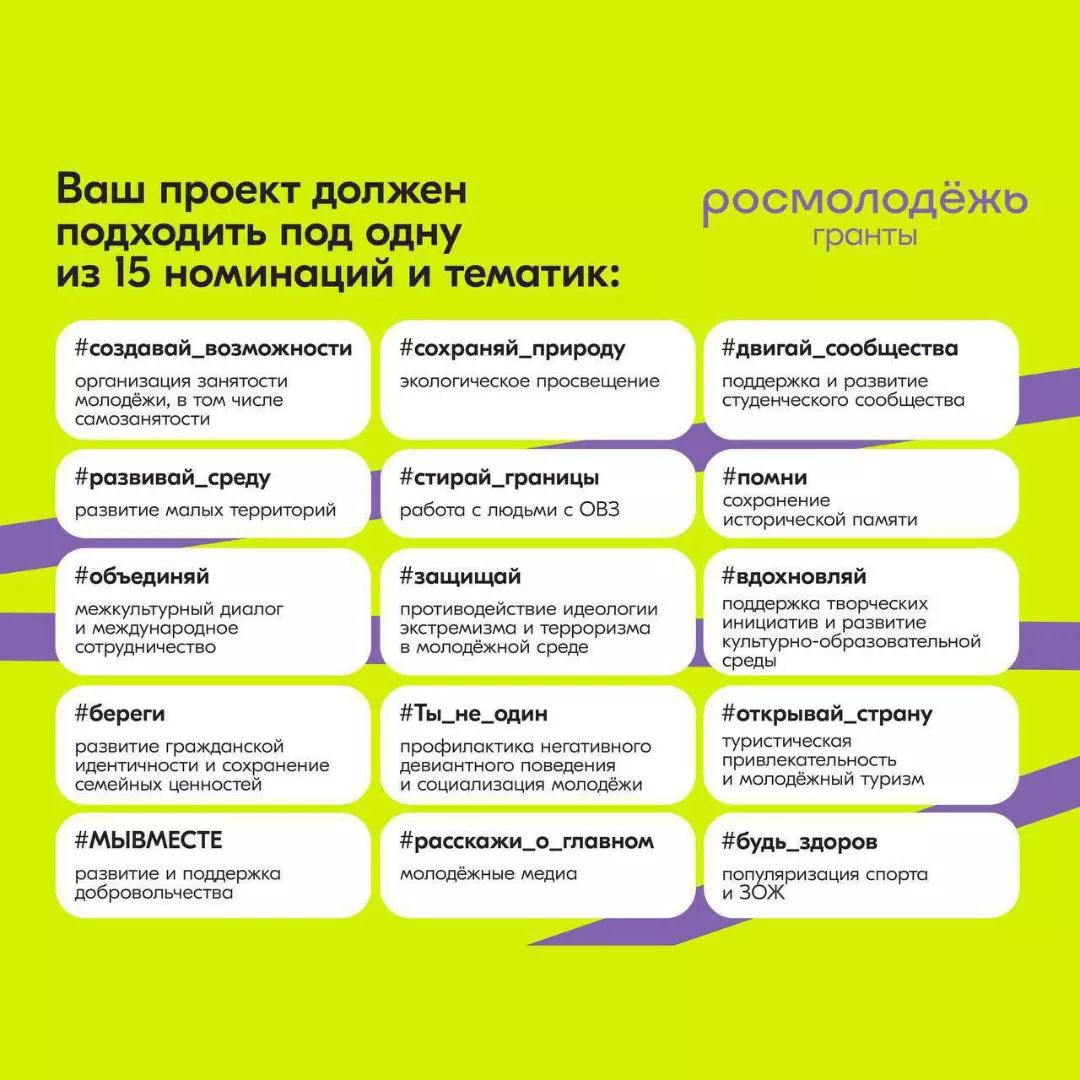 Принять участие в конкурсе могут абсолютно все граждане России в возрасте от 14 до 35 лет. Вам необходимо выбрать одну из 15 номинаций, под которую подходит ваш проект.