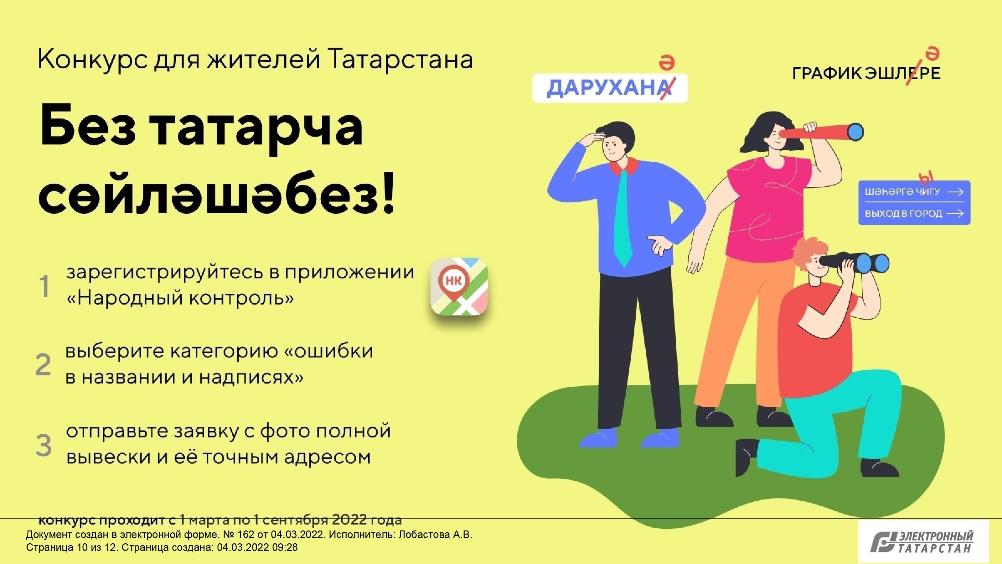 Буинцы могут присоединиться к конкурсу по привлечению жителей республики к выявлению ошибок в названиях и надписях на вывесках и информационных табличках на татарском языке. Принять участие в конкурсе, который проходит с 1 марта по 1 сентября, смогут все желающие жители Татарстана, зарегистрированные на портале госуслуг.