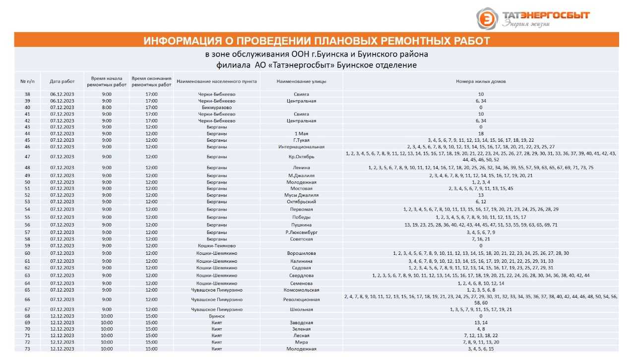 Информация о проведении плановых ремонтных работ в зоне обслуживания ООН г. Буинска и Буинского района филиала АО "Татэнергосбыт" Буинское отделение