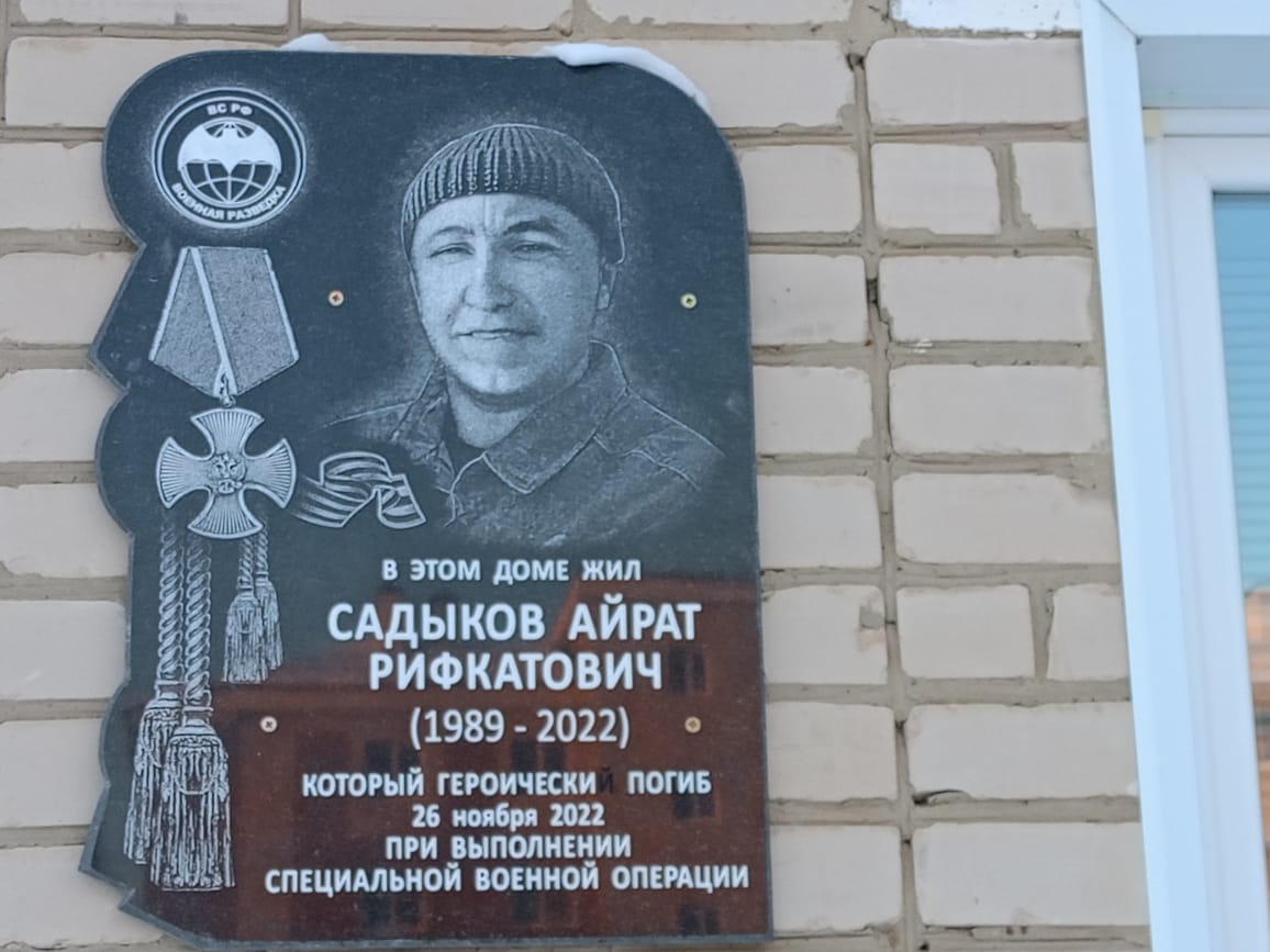 Мемориальную доску в память о погибшем в СВО земляке Айрате Садыкове установили на стене дома на улице К. Зыятдинова, в котором он жил.