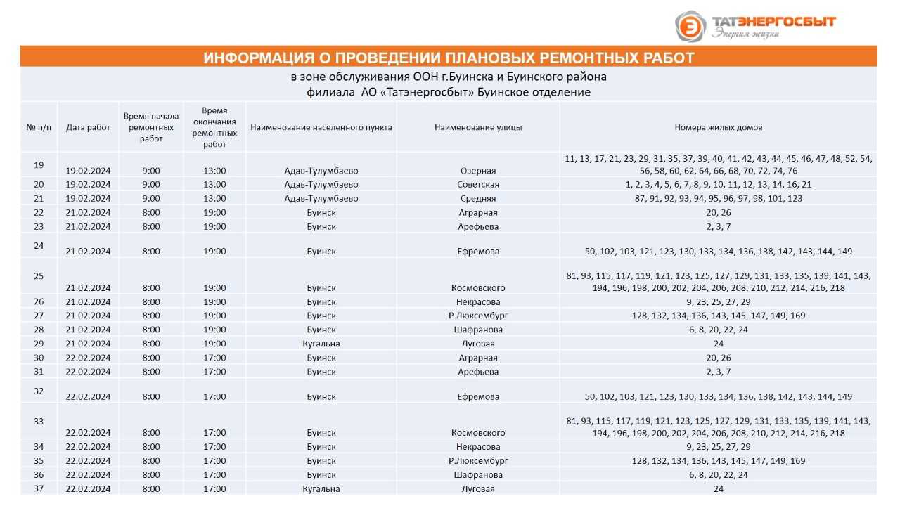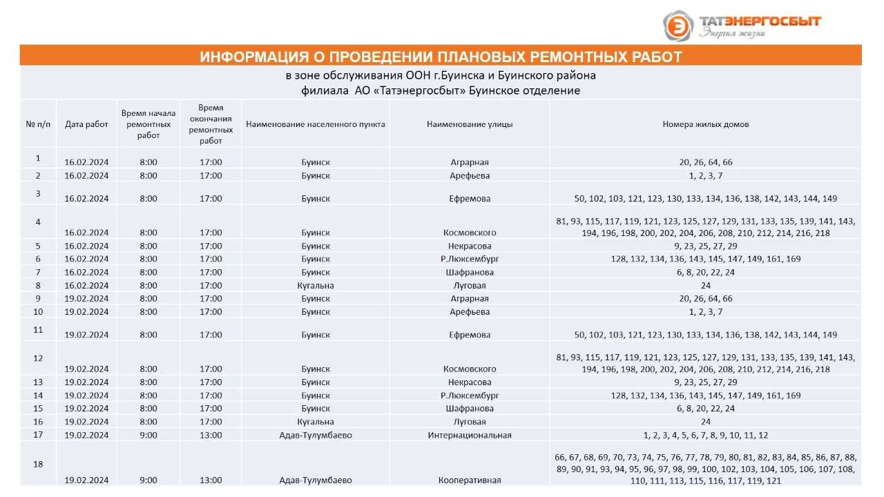 Информация о проведении плановых ремонтных работ в зоне обслуживания ООН г. Буинска и Буинского района филиала АО "Татэнергосбыт" Буинское отделение