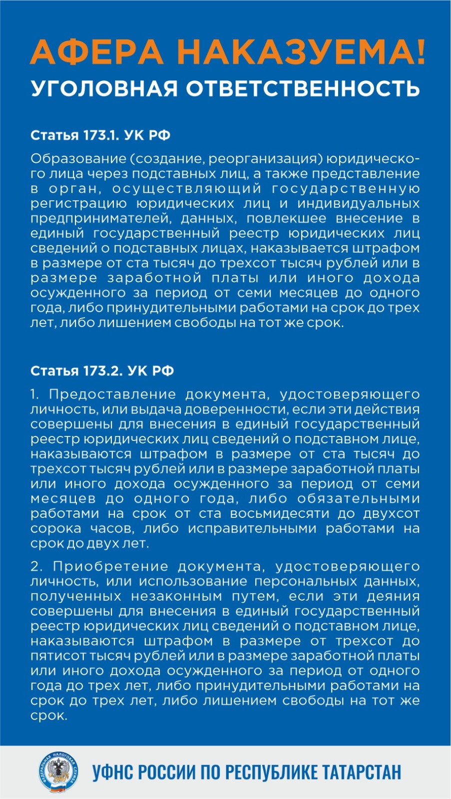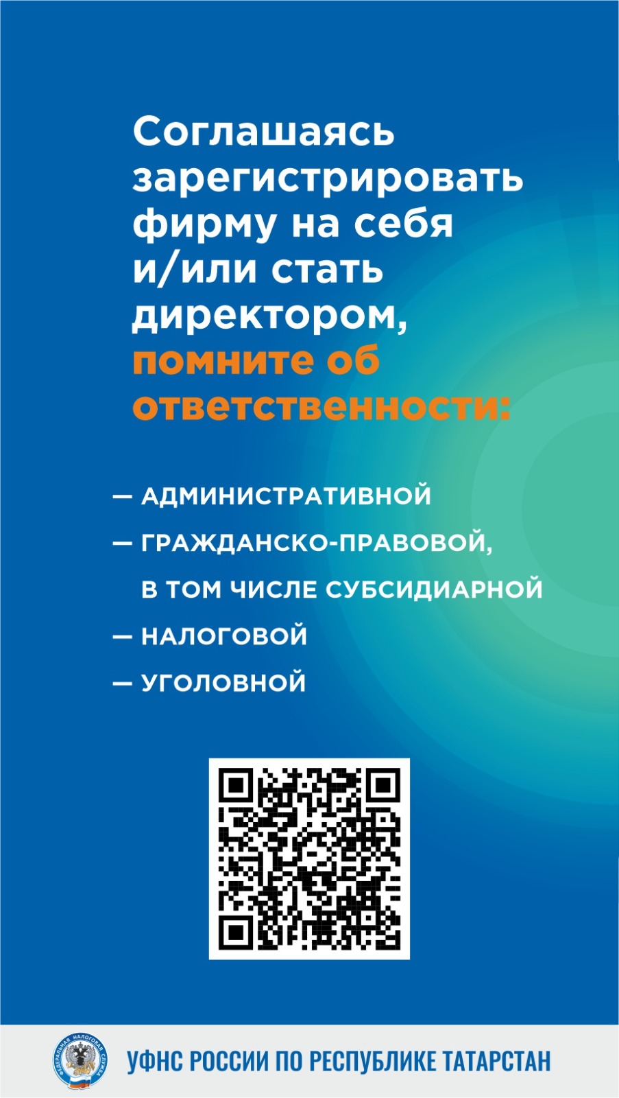 Соглашаясь зарегистрировать фирму на себя, помните об ответственности: административной, налоговой, уголовной, гражданско-правовой, в том числе субсидиарной. Так, в 2023 году налоговыми органами направлено в правоохранительные органы 245 материалов, по результатам рассмотрения которых уже вынесено 140 постановлений о возбуждении уголовных дел, судами вынесено 85 приговоров по подобным делам.
